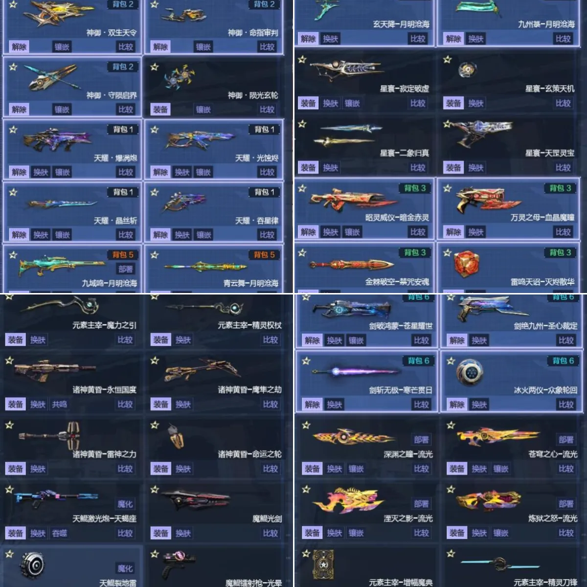 【近身武器】:神御守陨启界,天耀晶斩丝,星寰二象归真,青云舞月明沧海,幻域星爆先锋,神凰金棘破空禁咒安魂,剑斩无极寒芒贯日,终末之刃流光,元素主宰精灵刀锋,诸神黄昏雷神之力,魔鲲光剑,天极,创世鞭刃魔炎,审判之刃*2,虎王匕首,鹰王钩,狼王血刃,冥王剑,甜心萌兔双剑,猪年近战八戒,最终之剑,龙御水吞天,重装利刃,牛气冲天锋刃,空间撕裂者冰魄,如意金箍棒,
