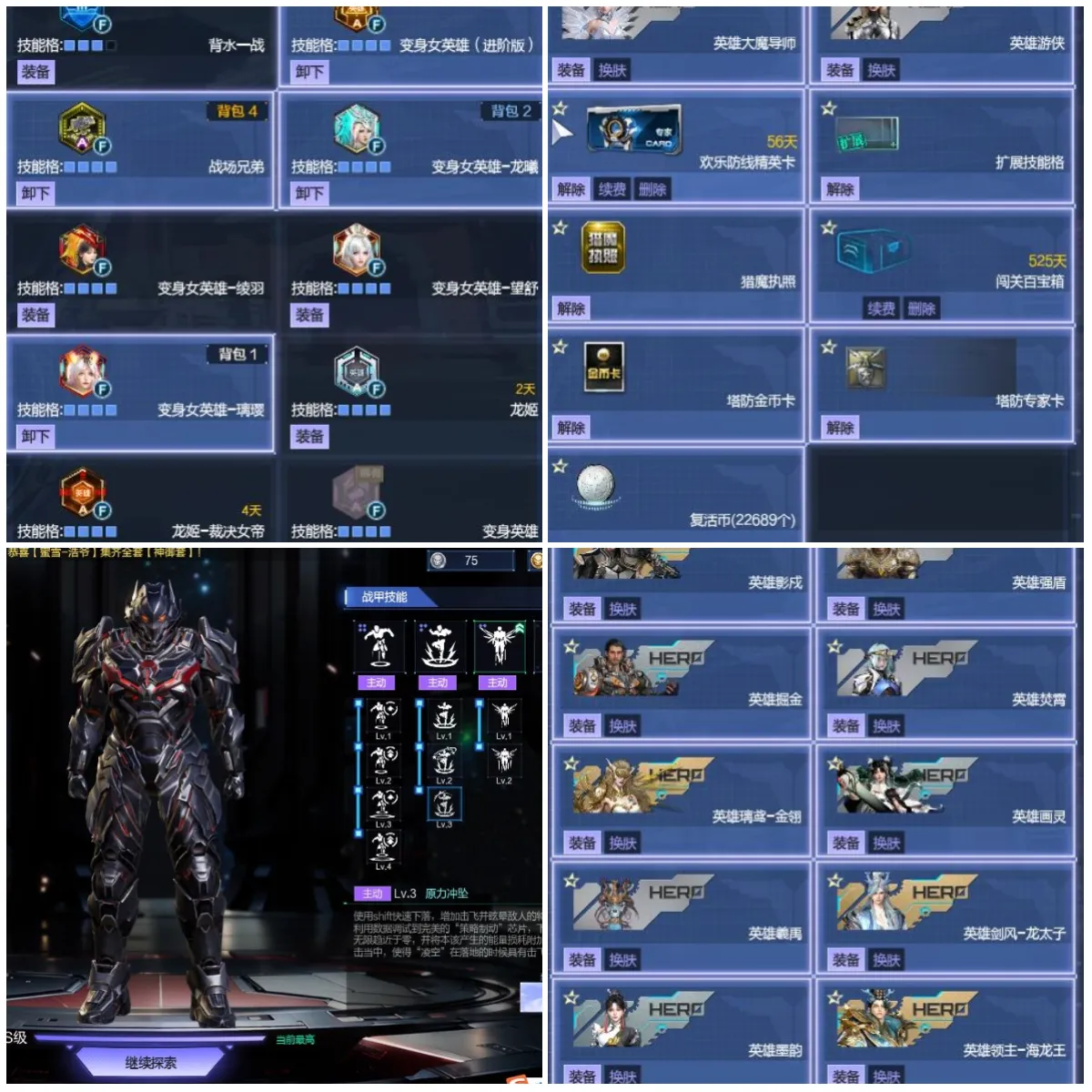 【技能】:扩展技能格,变身女英雄龙曦,变身女英雄璃璎,变身女英雄望舒,变身女英雄翎羽,爽快射击,变身女英雄进阶版,战场兄弟,