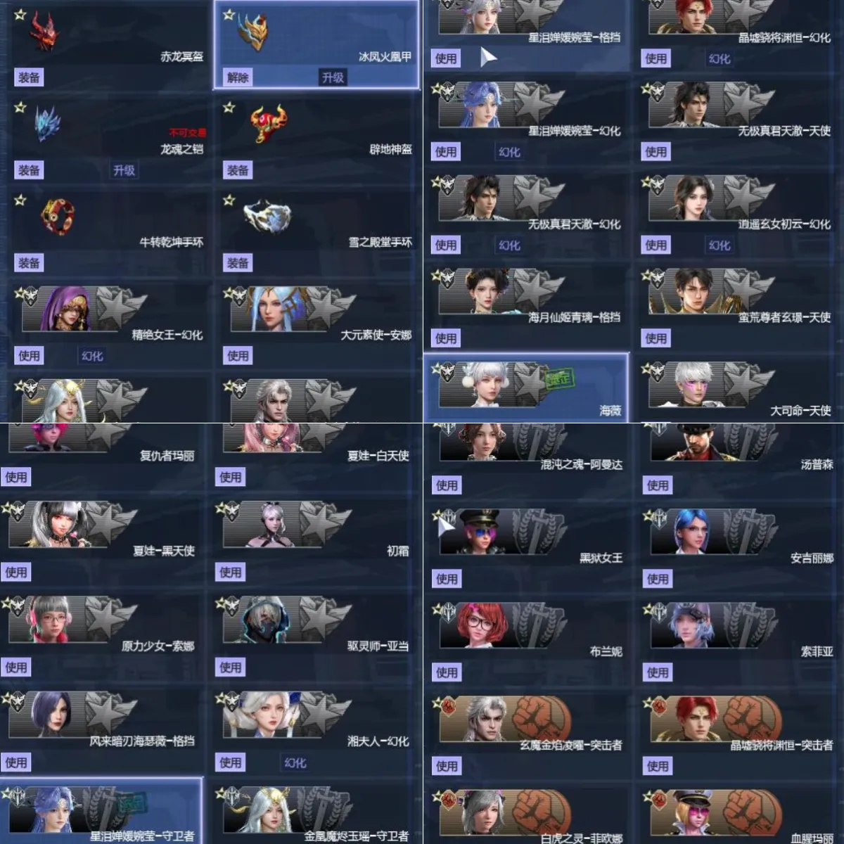 【角色】:精绝女王幻化,玉瑶幻化,凌曜幻化,凌曜天使,大元素使安娜,渊恒天使,婉莹格挡,渊恒幻化,天澈天使,天澈幻化,初云幻化,青璃格挡,玄璟天使,海薇幻化,大司命天使,湘军幻化,湘夫人幻化,湘军天使,海瑟薇格挡,路西法天使,爱丽丝位移,驱灵师亚当,原力少女索娜,初霜,夏娃白天使,夏娃黑天使,复仇者玛丽,玉瑶,婉莹,阿曼达,赤炎,汤普森,黑狱女王,安吉丽娜,布兰妮,索菲亚,凌曜,渊恒,秋月,菲欧娜,子怡,血腥玛丽,伊丽莎白,莫妮卡,安吉拉。