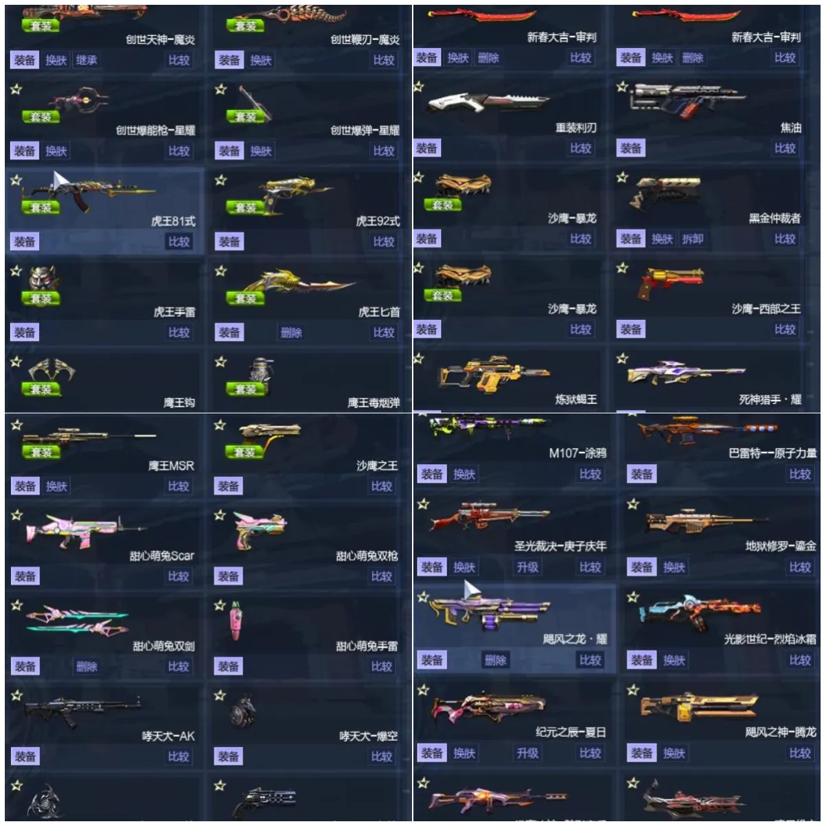 ②狙击枪:死神猎手耀,九域鸣月明沧海,深渊之瞳流光,诸神黄昏永恒国度,时间掌控者,地狱修罗鎏金,巴雷特原子力量,M107鲲鹏,MSR丘比特,M107混沌涂鸦,哮天犬狙月,MSR大圣,鹰王MSR,MSR蔷薇,M95飞电,圣光裁决庚子庆年。