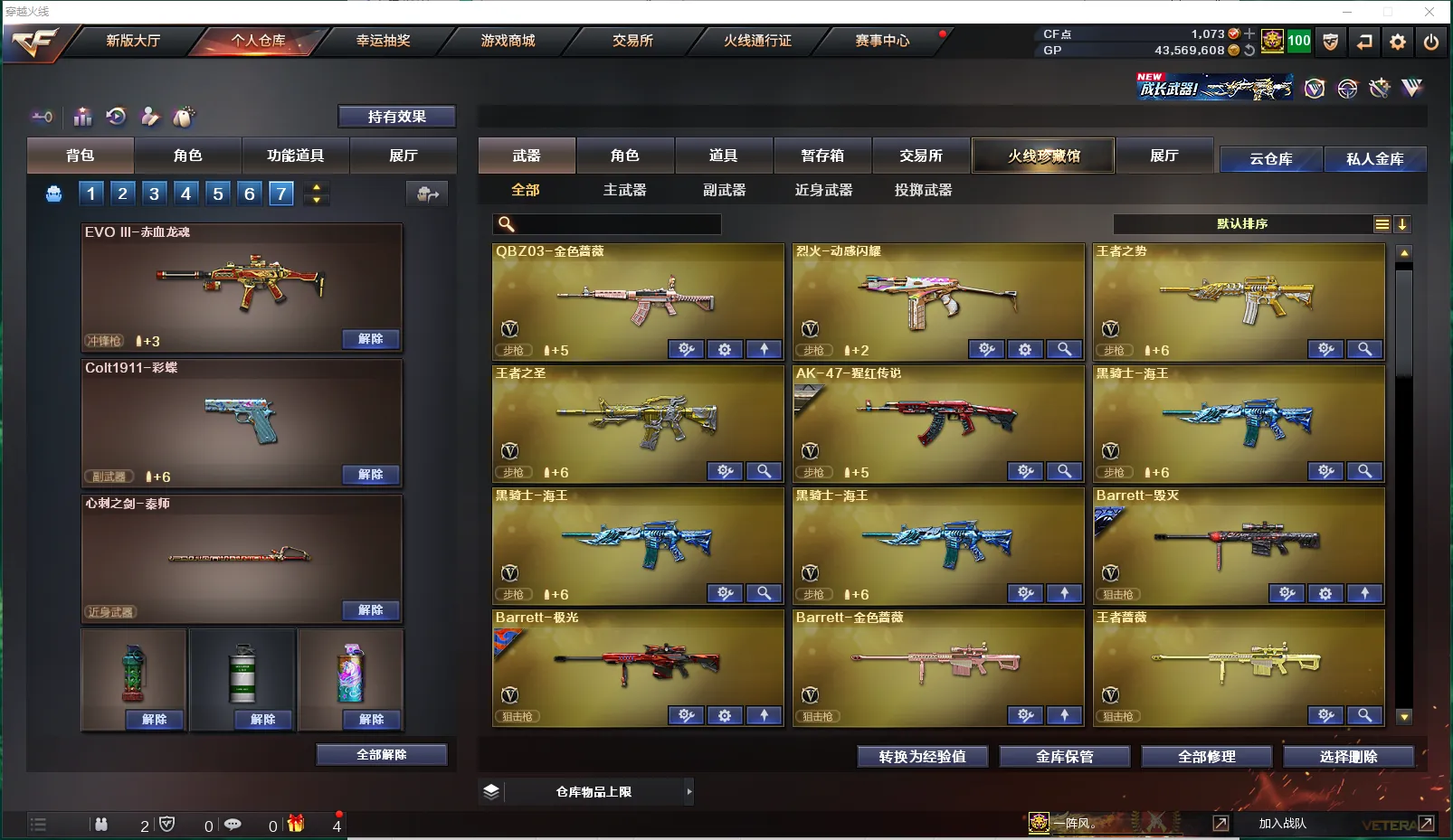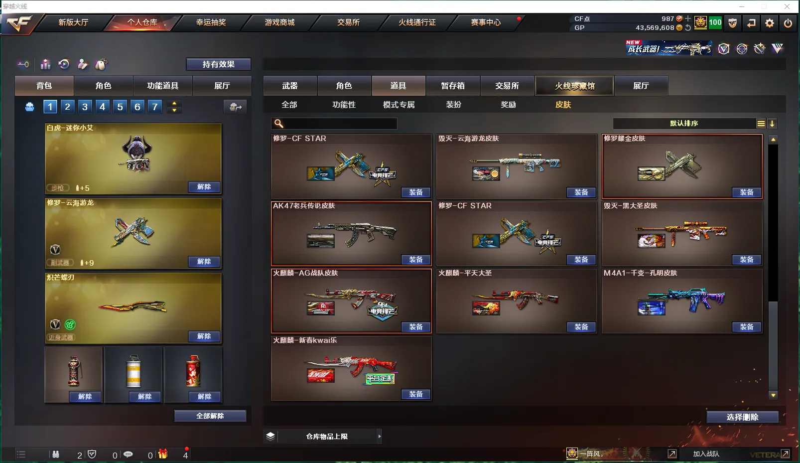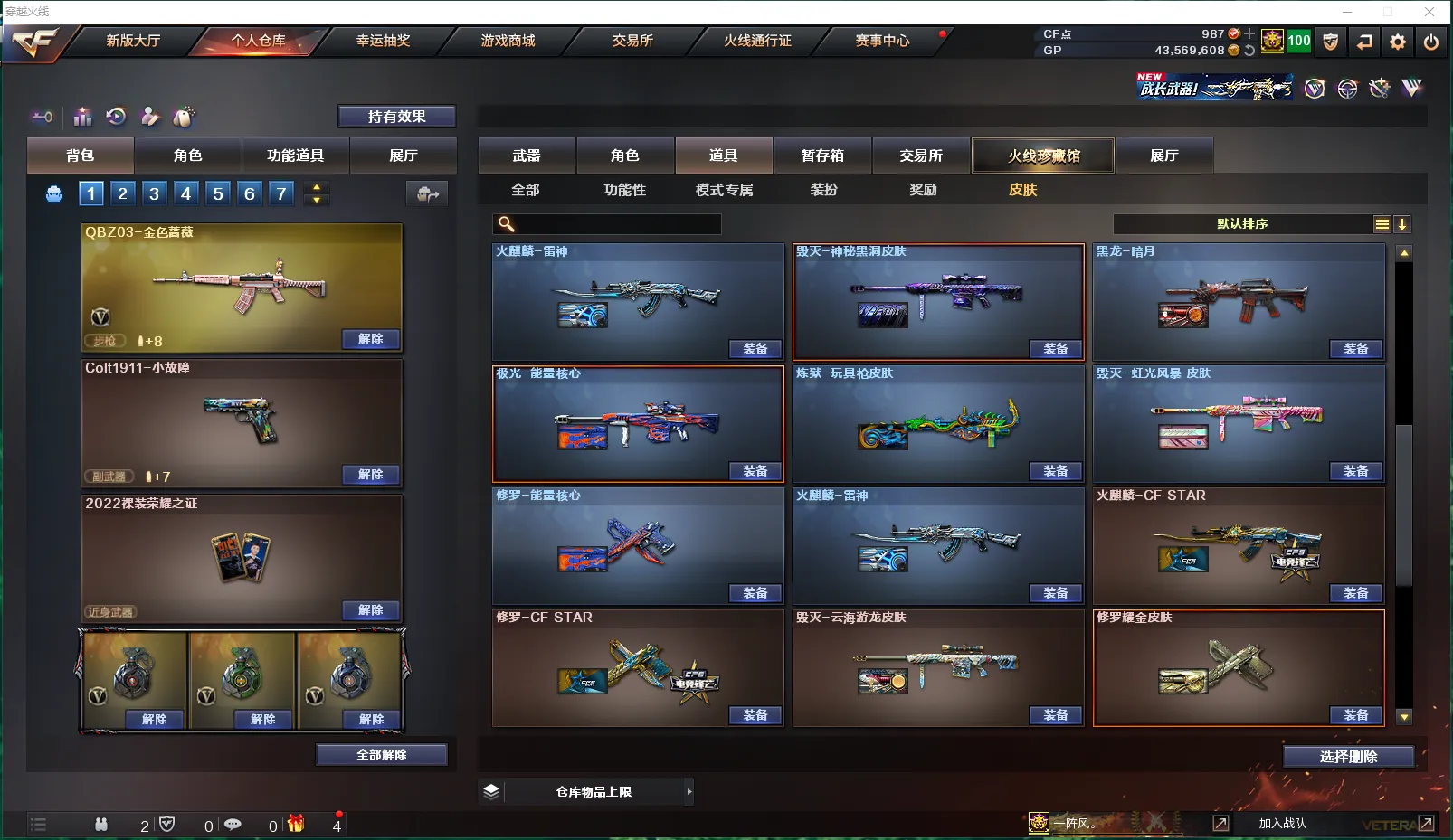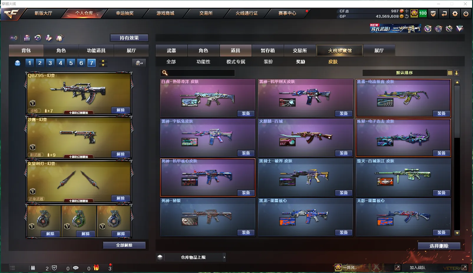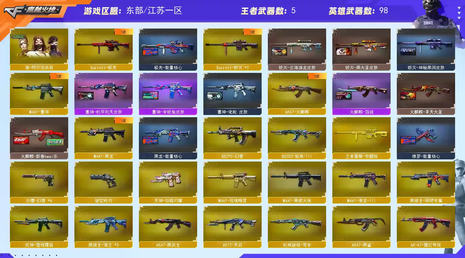 【皮肤】:毁灭-百城浙江皮肤、炼狱-电子连击皮肤、黑骑士-破界皮肤、毁灭-虹光风暴皮肤、雷神-机甲刑天皮肤、火麒麟-百城、雷神-宇航兔皮肤、死神-机甲核心皮肤、黑鲨-电流骇客皮肤、黑龙-能量核心、无影-能量核心、炼狱-玩具枪皮肤、黑龙-暗月、修罗-能量核心、火麒麟-雷神、死神-秘银、毁灭-神秘黑洞皮肤、极光-能量核心、火麒麟-AG战队皮肤、火麒麟-平天大圣、AK47老兵传说皮肤、修罗耀金皮肤、M4A1-千变-孔明皮肤、火麒麟-CFSTAR、修罗-CFSTAR、毁灭-云海游龙皮肤、毁灭-黑大圣皮肤、火麒麟-新春kwai乐
