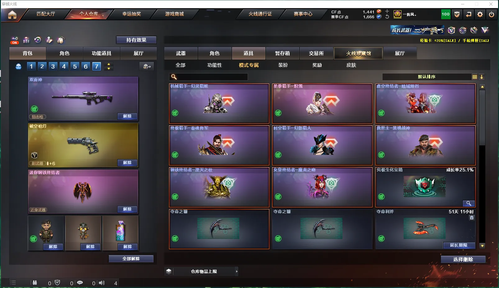 妖姬、变异宝贝、疯狂宝贝、绿色巨人、灵魂忍者、迷雾幽灵、夺命之镰、幽灵之刃、夺命利斧、生化弹匣、防化服、减少停顿道具(不退包)、6盘6烈