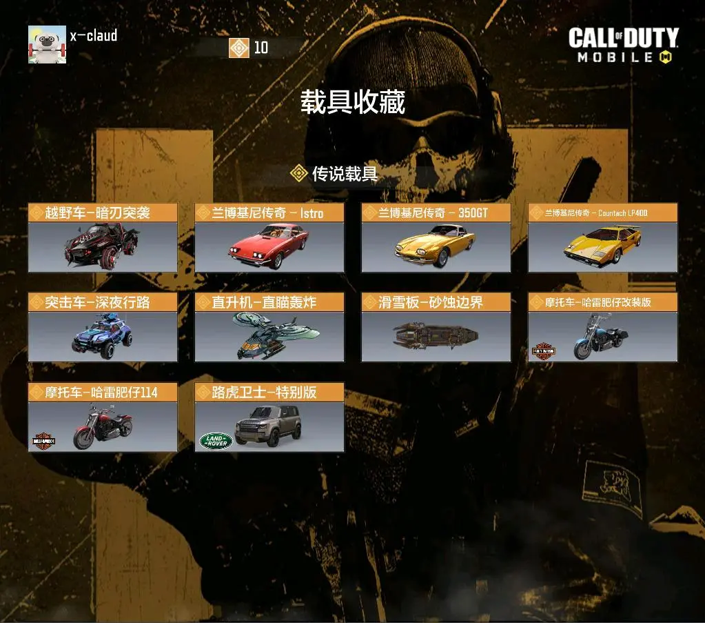 路虎卫士-特别版✅摩托车-哈雷肥仔114✅摩托车-哈雷肥仔改装版✅滑雪板-砂蚀边界✅直升机-直瞄轰炸✅突击车-深夜行路✅兰博基尼传奇- Countach LP400✅兰博基尼传奇- 350GT✅兰博基尼传奇 -lstro✅越野车-暗刃突袭✅