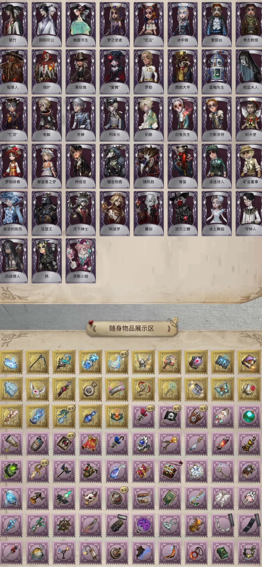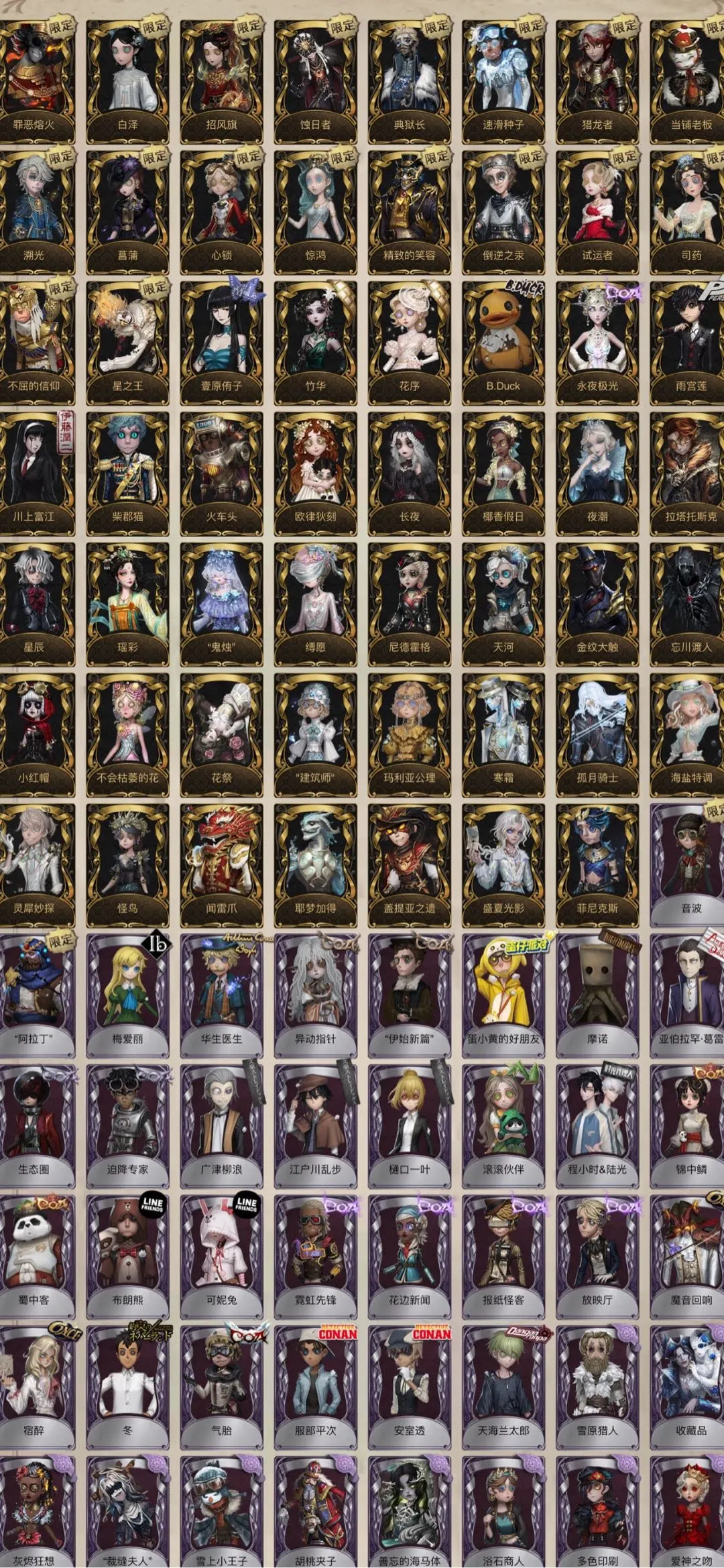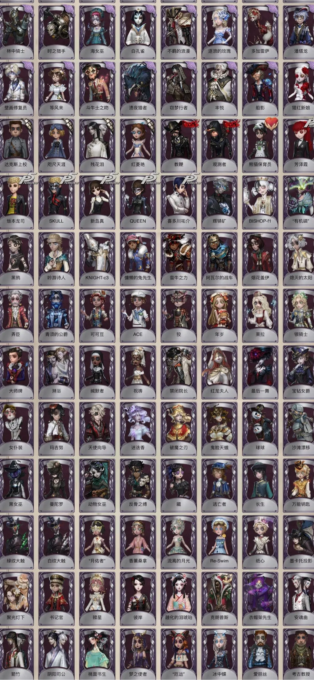 全角色 翦烛 筠心 夜之商籁 缚愿 鬼烛 盛夏光影 溯光 星之王 雨宫莲 Skull坂本龙司 倒逆之汞 玛利亚公理 柴郡猫川上富江欧律狄刻 闻雷爪 招风旗 耶梦加得壹原侑子沉默宫殿 盖提亚之遗 天河 椰香假日花序 B.Duck 永夜极光 白泽套 蚀日者 典狱长 速滑种子 猎龙者 当铺老板 菖蒲 心锁 惊鸿套 精致的笑容 试运者 不屈的信仰 火车头 夜潮 拉塔托斯克 长夜星辰 尼德霍格 金纹大触 忘川渡人套 小红帽 不会枯萎的花 花祭 建筑师 寒霜 孤月骑士 海盐特调 灵犀妙探套 怪鸟套 菲尼克斯
