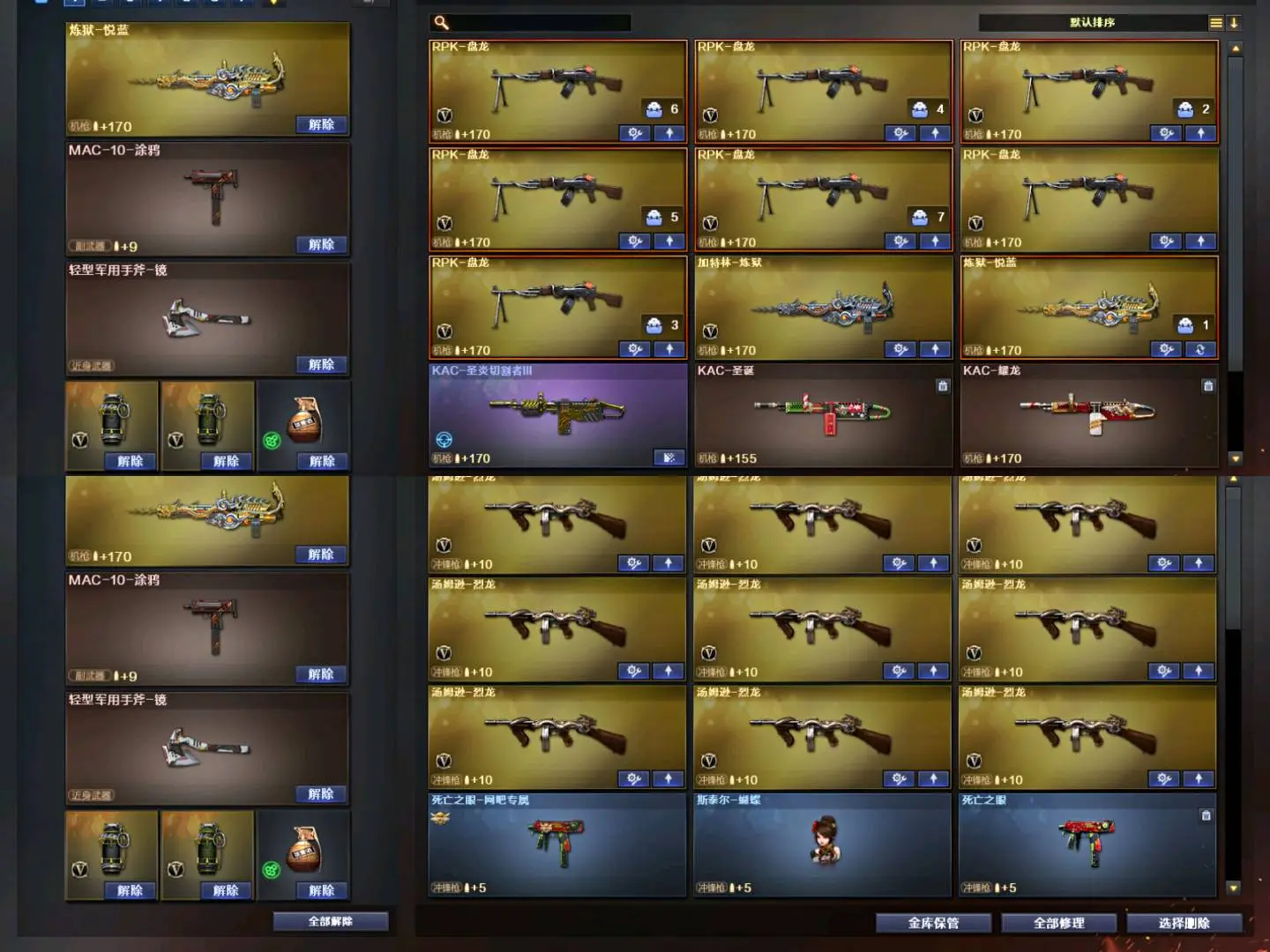 【辅助枪】RPK-盘龙*6 / 加特林炼狱/油炸悦蓝/汤姆逊-烈龙*6/AA12-雷霆/冰龙粉碎者/神圣爆裂者/激光毁灭者/白马银枪/迷你生化手雷/死亡之眼CFS庆典/ 斯太尔蝴蝶 / 六烈六盘 / 六盘六烈 / 6烈6盘 / 6盘6烈 /生化号 / 爆破号 /