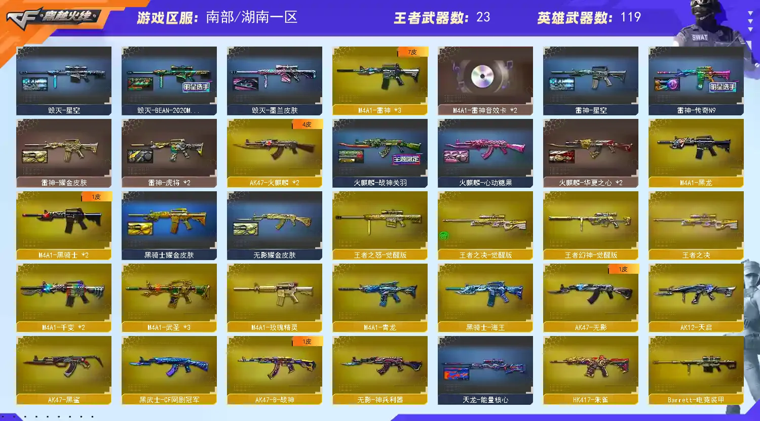 【步枪系列】M4A1-雷神*/传说光耀/千变/黑龙/黑骑士*2/武圣/青龙/龙血/玫瑰精灵/猎神/精英刀锋/海王/能量核心/摸金校尉/赛博朋克/AK47-火麒麟/无影/黑鲨/黑武士网剧套装/战士/战神/常胜将军/摸金校尉/桃园结义/能量核心/龙太子/冰龙粉碎者/天启/朱雀/白虎/烈火/火麒麟-灵狐/火麒麟-绝迹