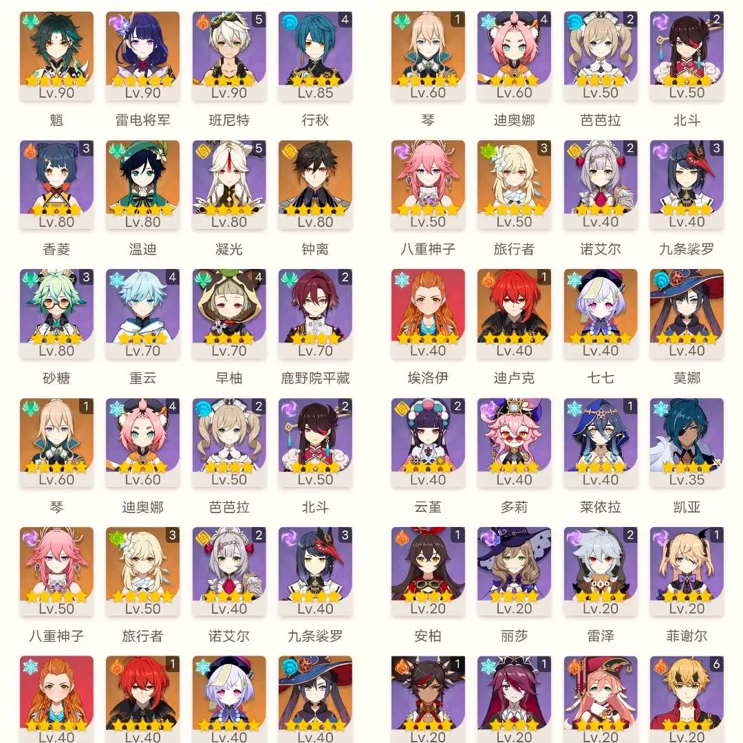 【全平台】 14黄 90魈 90雷神 钟离 温迪 八重神子 五命班尼特 四命行秋一命琴 一命迪卢克等 号毁过