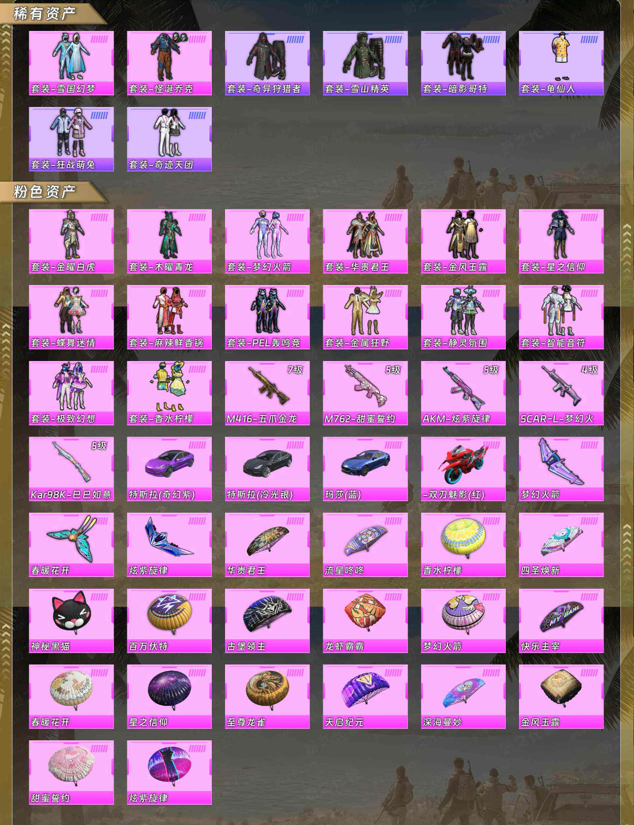 【粉色套装】套装-金曜白虎/套装-木曜青龙/套装-梦幻火箭/套装-华贵君王/套装-金风玉露/套装-星之信仰/套装-蝶舞迷情/套装-麻辣鲜香锅/套装-PEL轰鸣竞梦者/套装-金属狂野/套装-静灵氛围/套装-智能音符/套装-极致幻想/套装-香水柠檬