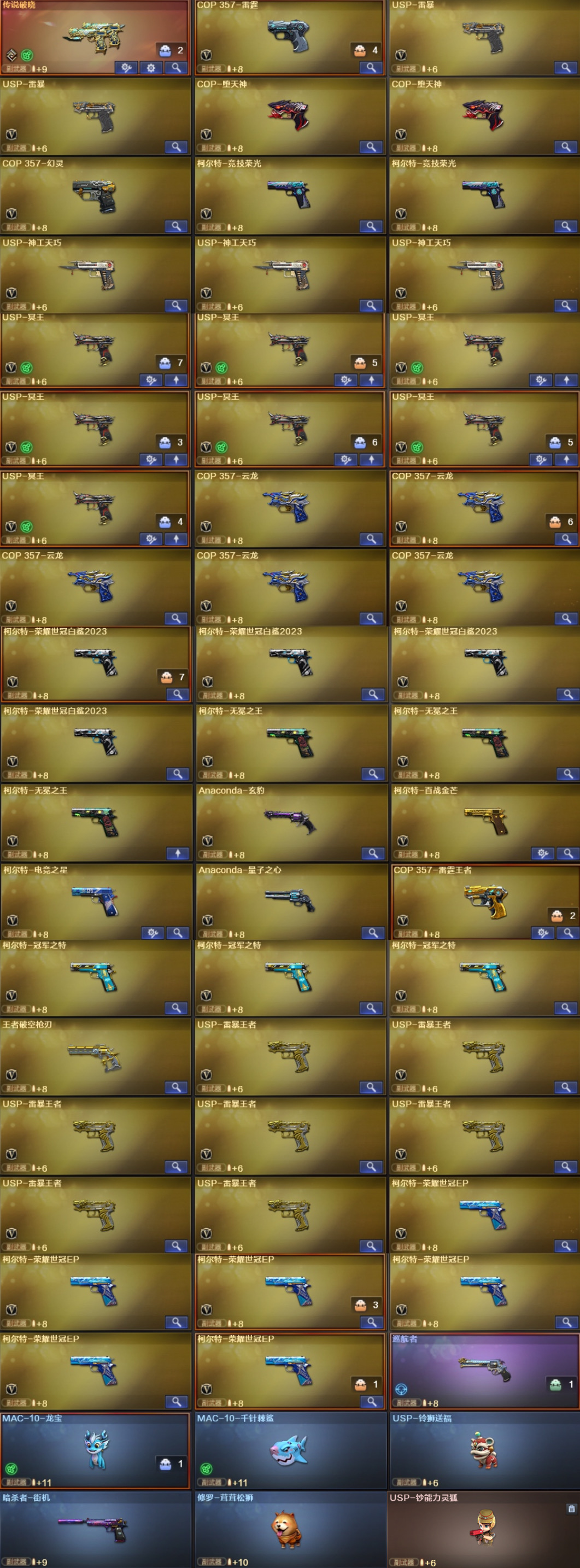 极品副武器:百战金芒柯尔特 电竞之星柯尔特 ⑦雷暴王者usp ⑦冥王usp ⑥ep柯尔特 ③冠军之特 ④白鲨特 无冕之王 ②雷暴usp ③神工天巧usp ⑩英雄级cop
