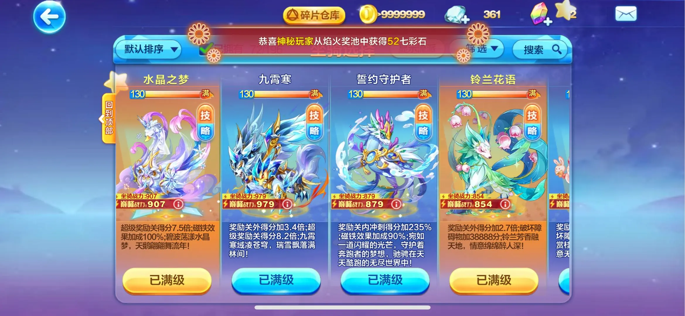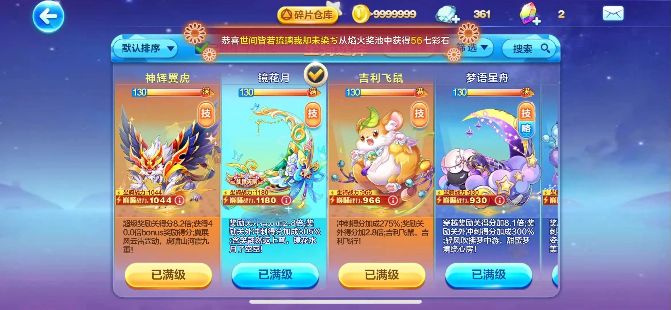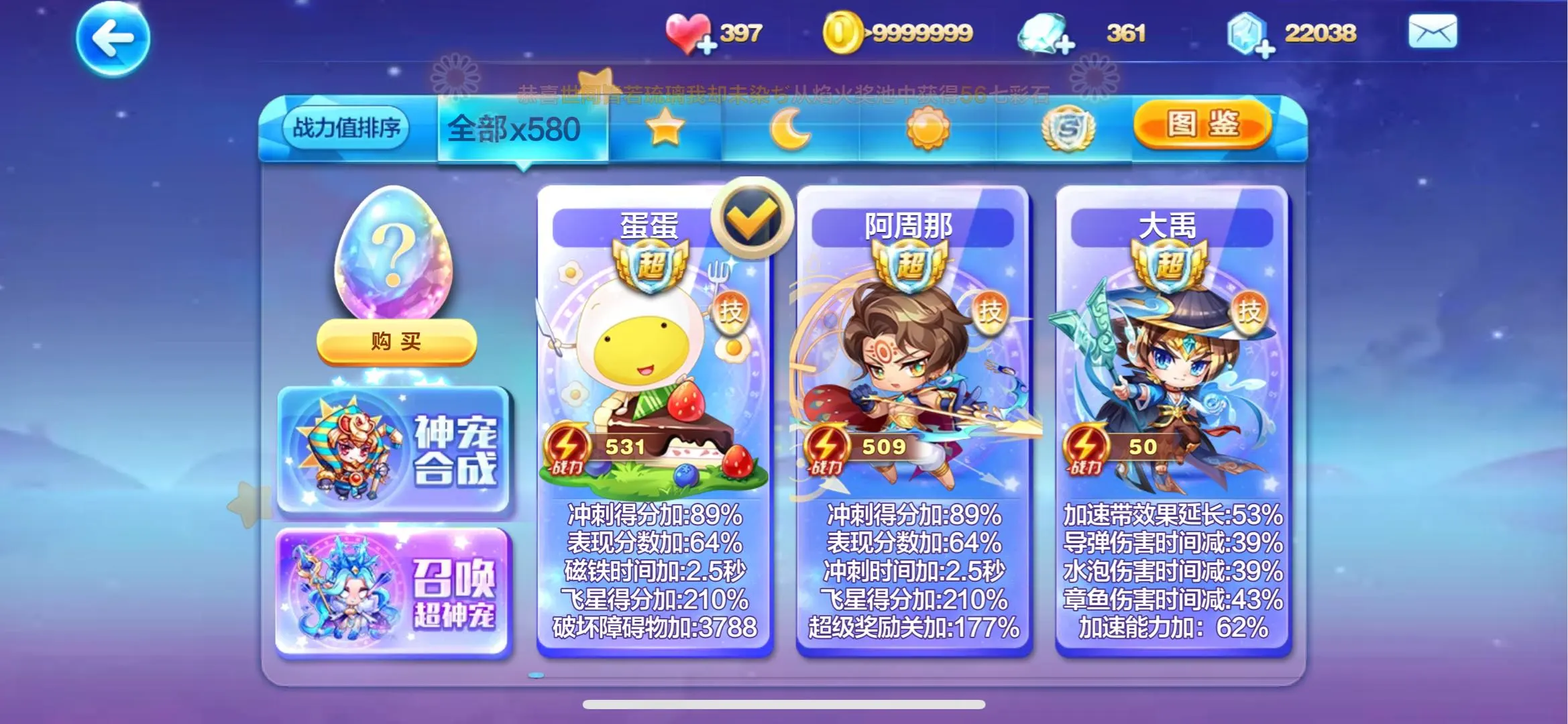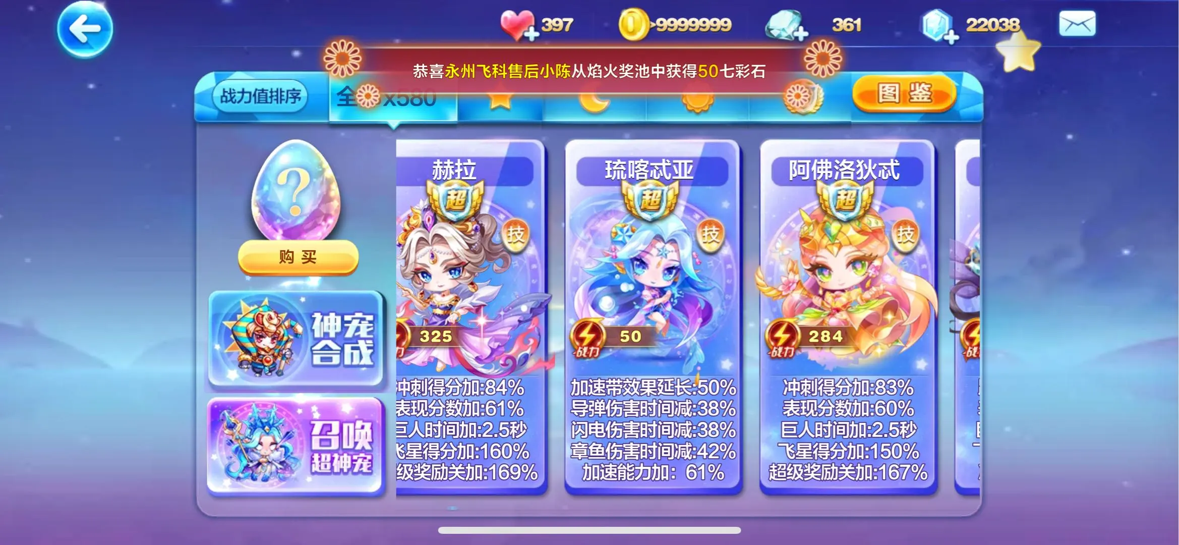 镜花月!石矶!九霄寒!喜羊羊!提亚马特!蔡文姬!尼刻!菠萝吹雪!阿周那!蛋蛋!大禹!胜利之神?穆桂英!水晶之梦!铃兰花语!寒冰龙王!沉香!撒旦!羲和!轩辕!财神!牛魔王!精卫!共工!阿修罗!阿波罗!!时空之神!辉夜!雷神索尔!祝融!ss神宠全满