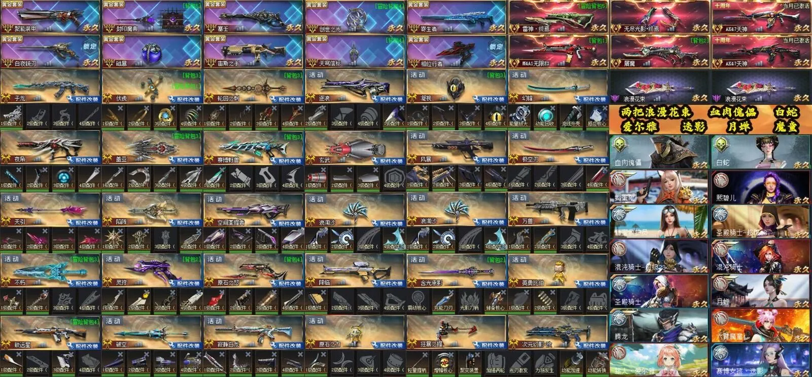 配件武器:凝视4配⭐降临1配⭐不朽12配⭐灵狩4配⭐原石之怒4配⭐含光承影24配⭐幻锋4配⭐英勇比伯12配⭐致远星13配⭐破空4配⭐寂静白龙4配⭐原石之力1配……