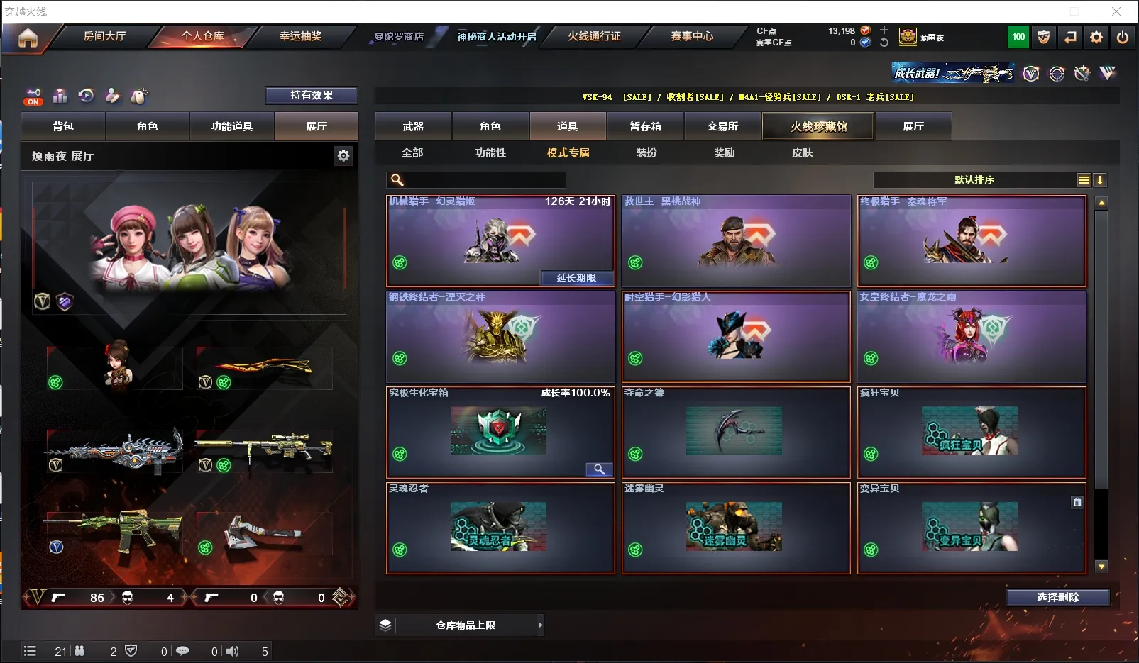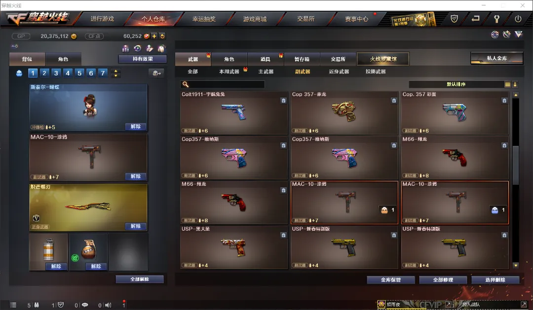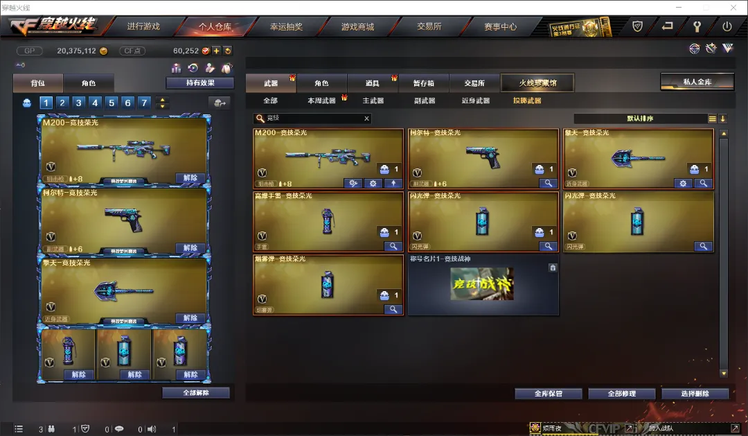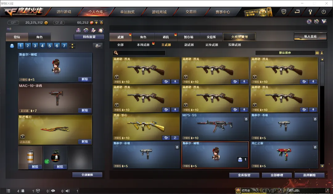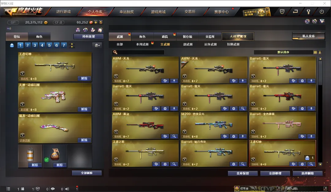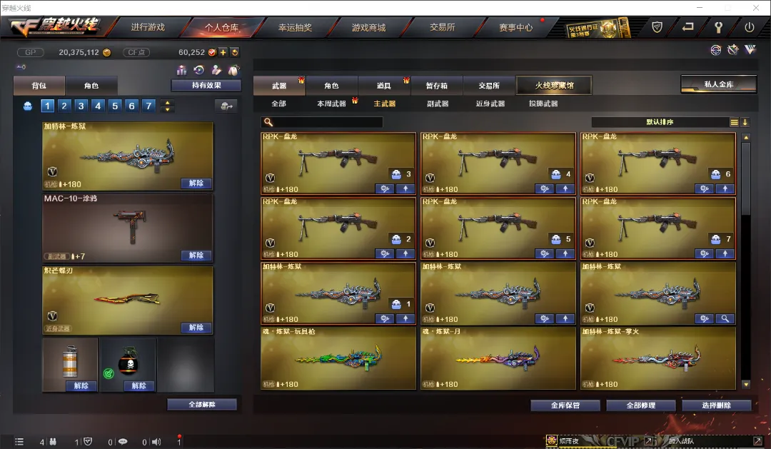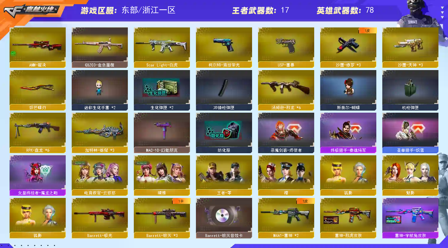 武器:王者幻神 炽芒蝶刃 六盘龙 六烈龙 加特林-炼狱*3 斯泰尔-蝴蝶 AWM-裁决 天龙 毁灭 金色蔷薇 竞技荣光套 A180-蓝色骑士 MAC-10-涂鸦 疾爆烟雾弹 六盘龙 六烈龙。