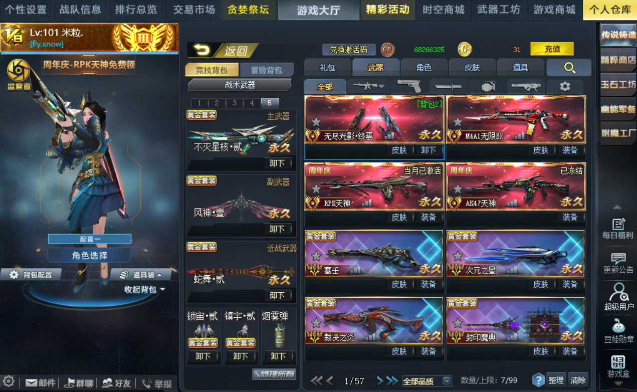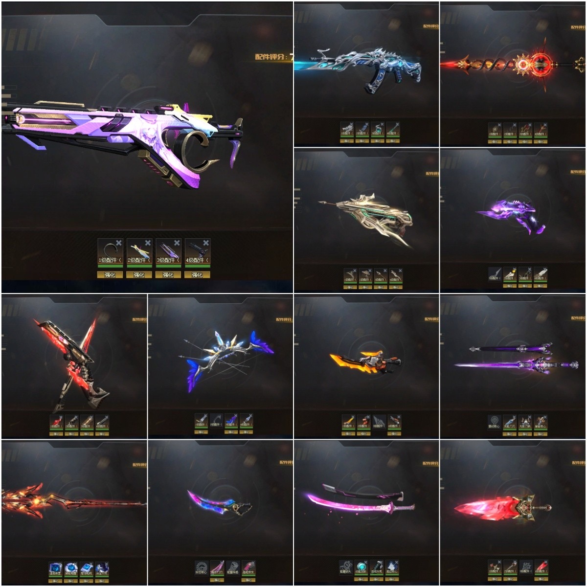 【配件武器】满配幻彩天虹、满配终末之弩、满配子龙、满配轮回之刺、满配原石之怒、满配天界使者、三配灵狩、三配幻锋-樱之舞、三配不朽、三配耀光、三配翎羽、二配戏法