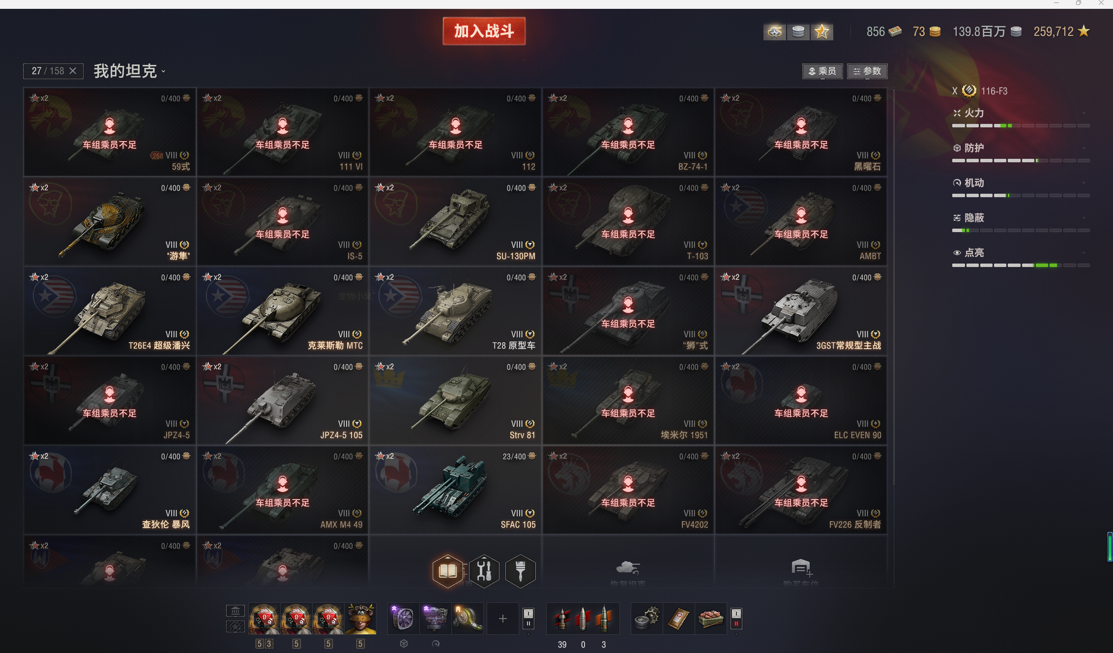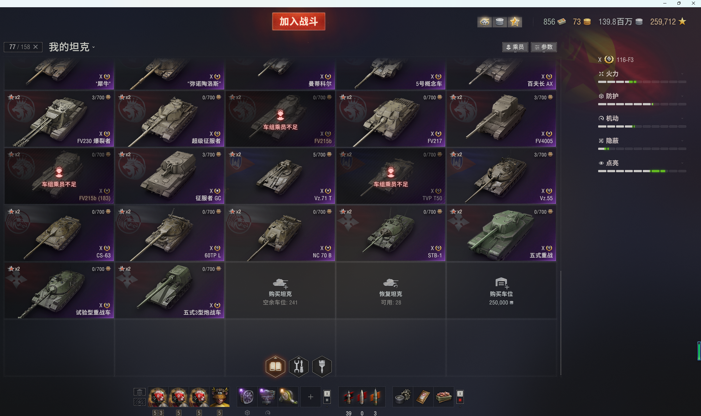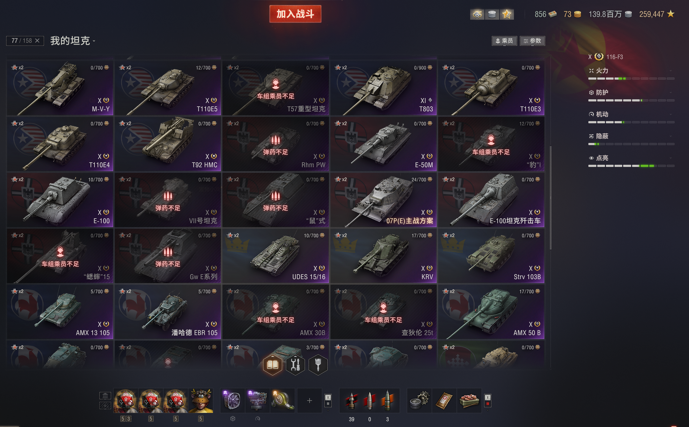 11级KR-1,T803。10级76X全系,所有银币10级全部在库。10金:116F3,铲子豹,T22,268v型,113,121b,183,伏羲155,121b等。9金19台:SDT-58v,SU-122v,守望者,维钦托利,590,T-54d,眼镜蛇,1b概念,BZ-58-2,wz114等。8金27台:法蝎(sfac105),SZDVvz,BZ-74-1,查狄伦暴风,反制者,AMBT等等。