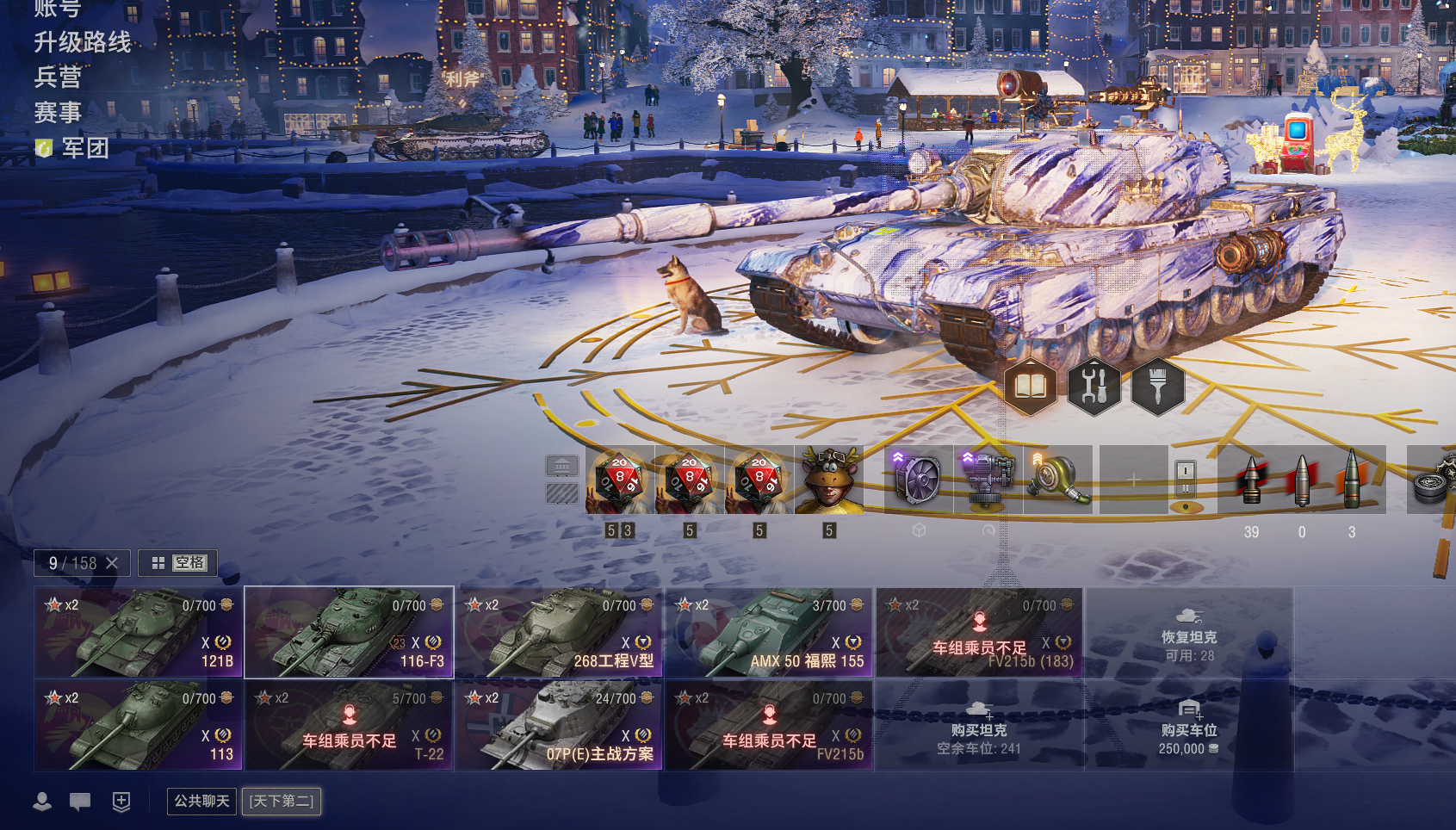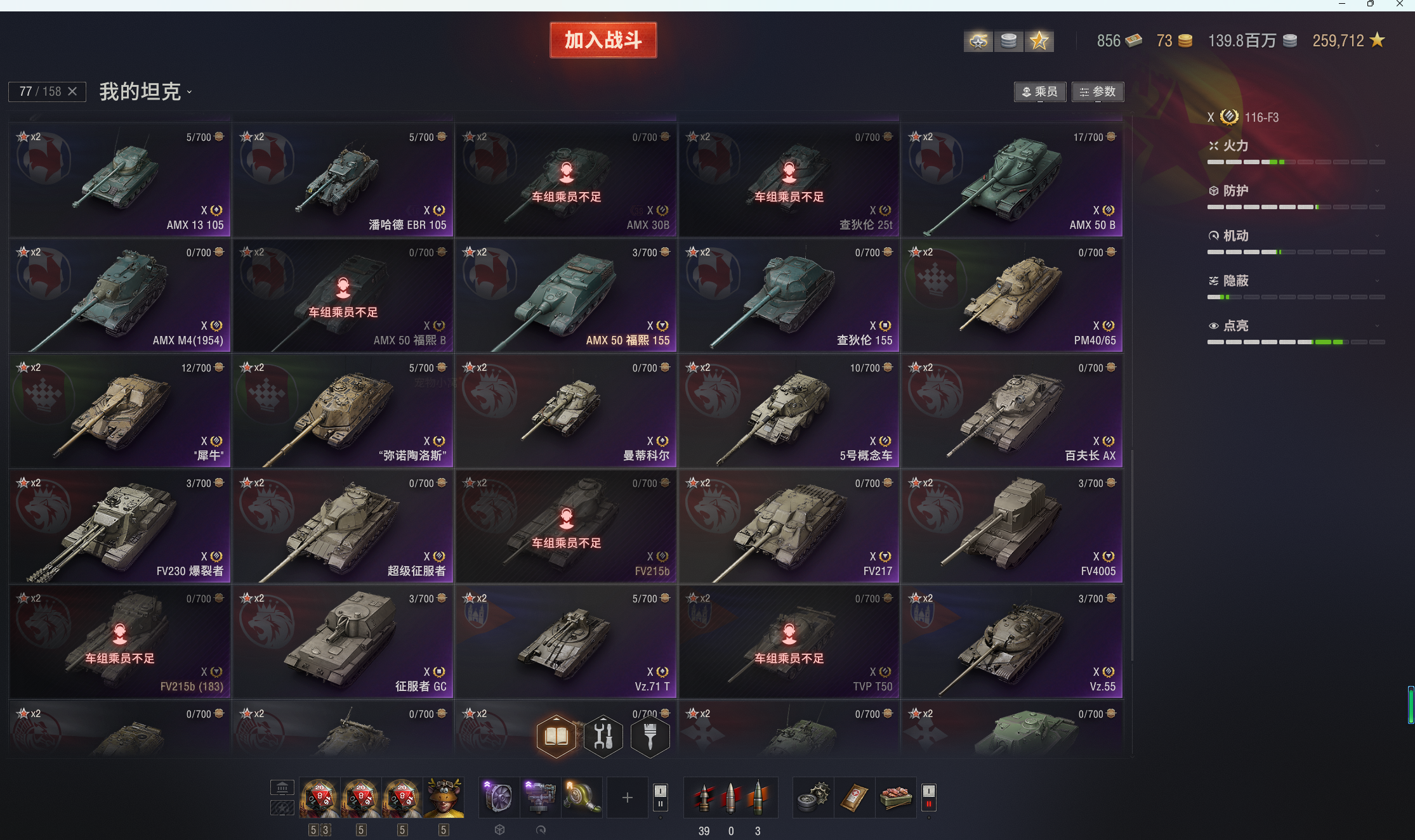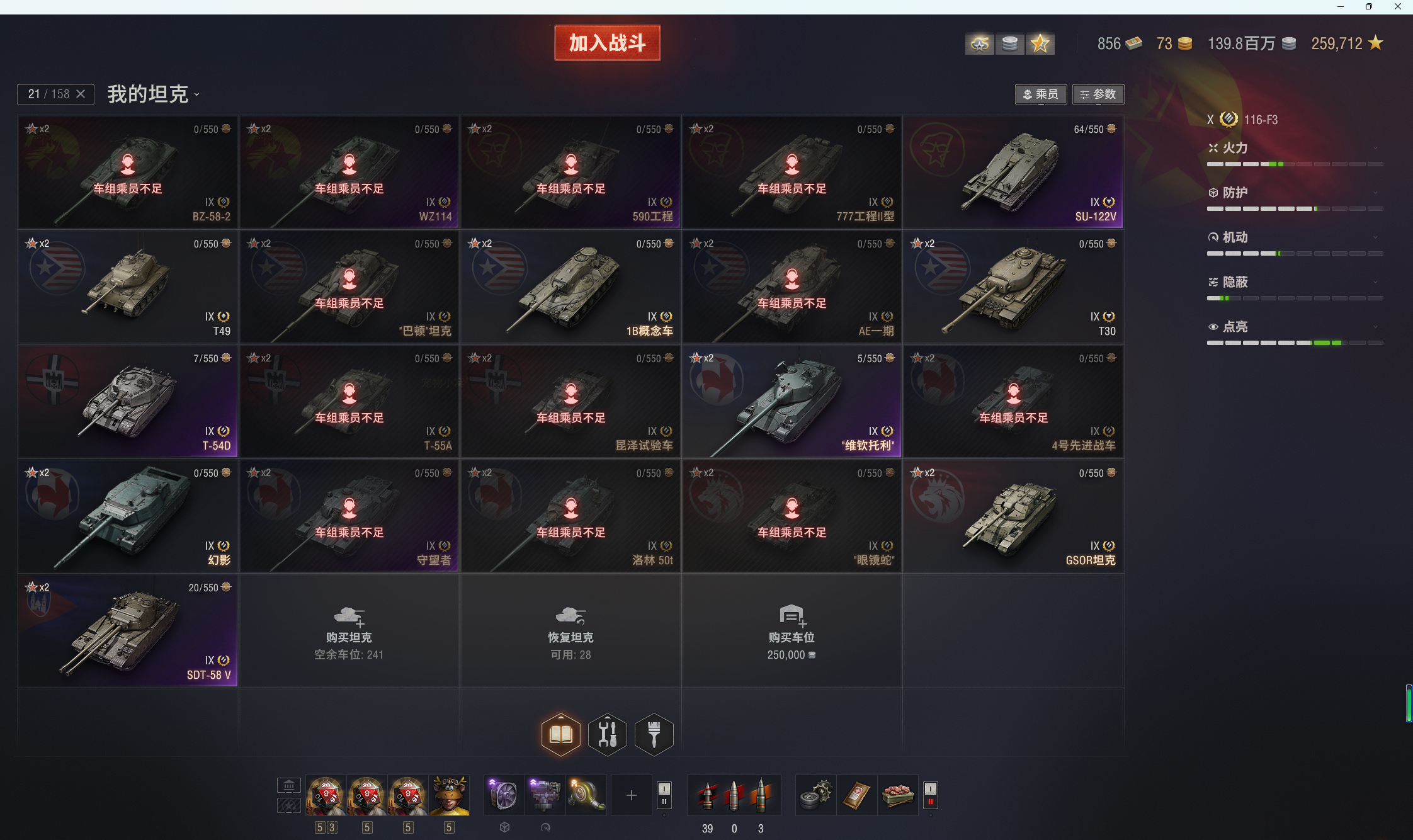 11级KR-1,T803。10级76X全系,所有银币10级全部在库。10金:116F3,铲子豹,T22,268v型,113,121b,183,伏羲155,121b等。9金19台:SDT-58v,SU-122v,守望者,维钦托利,590,T-54d,眼镜蛇,1b概念,BZ-58-2,wz114等。8金27台:法蝎(sfac105),SZDVvz,BZ-74-1,查狄伦暴风,反制者,AMBT等等。