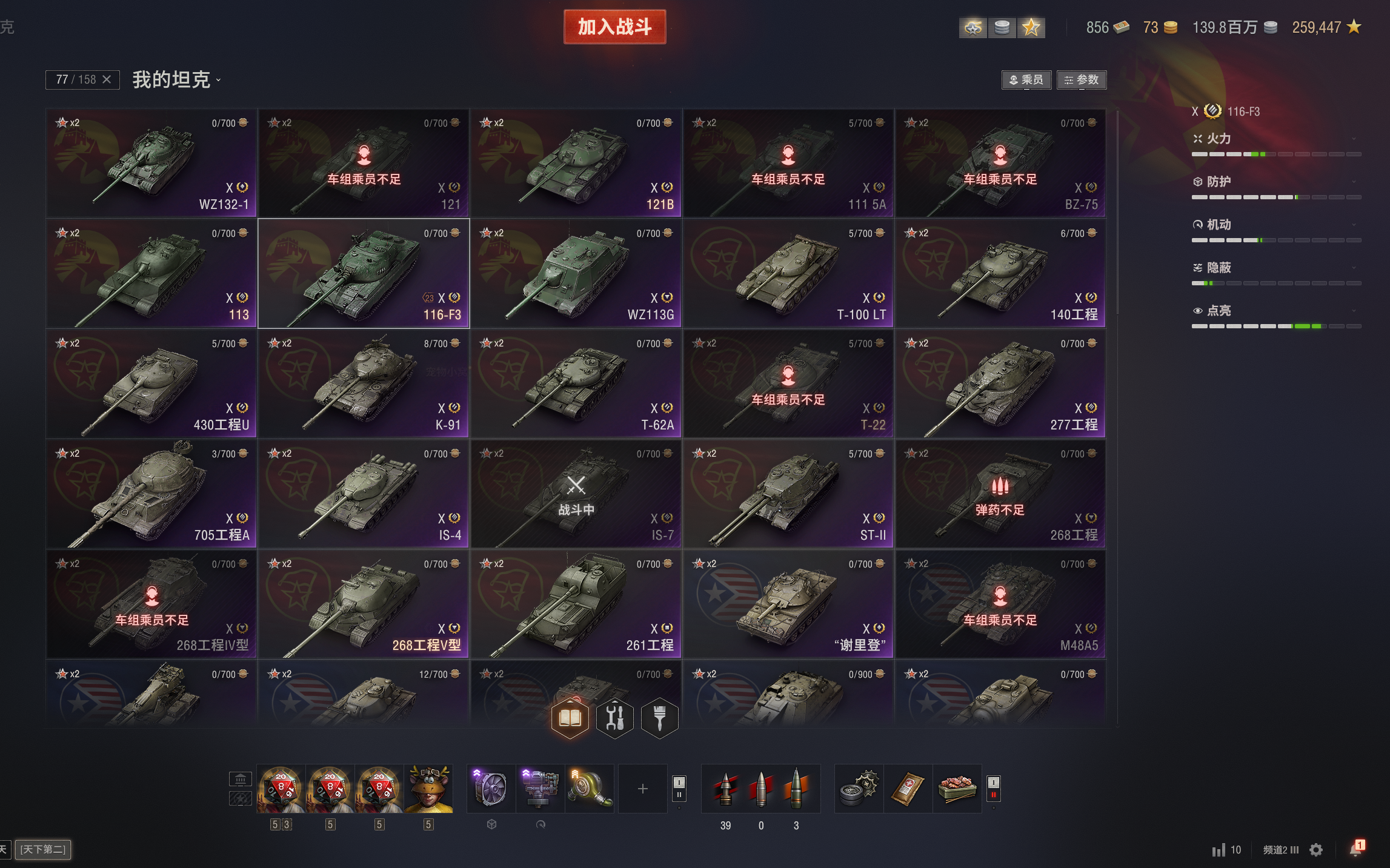 注意事项:1,进入游戏后,如果车辆情况不符。那是因为前面的玩家筛选了自己玩的坦克,其他的隐藏了。坦克显示栏,左下角小坦克标志,点进去把所有系别和级别选上,坦克就全部出来了。