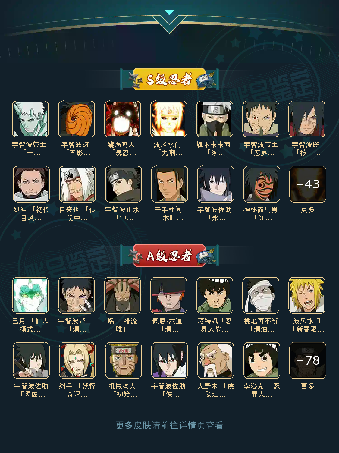 仙人自来也 纲手 波风水门 百战水门 猿飞日斩 千手柱间 宇智波斑 宇智波鼬 舞之自来也 大蛇丸 百战大蛇 秽土四代 秽土三代 秽土长门 仙人兜 黄猿九喇嘛鸣人 紫狗永恒佐助 樱婊忍战樱 秽土鼬 普通自来也 百豪纲手 死门凯 二代扉间 秽土二代 秽土初代 秽土柱间 白面具 须佐卡卡西 小胡子鬼灯幻月 雷影 土影 无 佩恩 百战佩恩 青年柱间 创立初代 秽土斑 青年斑 解斑 须佐止水 虎皮 破面带土 红夜带土 罗砂 秽土三代风影 忍战雷影 三代雷影 金角银角 秽土半藏 忍战大野木 小土豆 天道超 大筒木桃式 大筒木金式 钢铁之躯凯 桀骜之刃阿斯玛 狂野之鲨鬼鲛 飞段 黑飞段 百豪樱 忍战李 大卡卡西 五代水影照美冥 宇智波鼬 仙鸣 九尾查克拉鸣人 鹰佐 奇拉比 青年艾 半蛇兜 晓蛇 新春鼬 面麻 须佐佐助 疾风咒印佐助 忍战宁次 忍战天天 最终章雏田 幻容卡卡西 神卡 忍战卡卡西 泳装卡卡西 忍战凯 青春哥 惊门凯 爱情哥 新春止水 新春水门 青年水门 青水 新春我爱罗 泳装照美冥 侠隐照美冥 侠隐纲手 侠隐兜 漂泊再不斩 漂泊佩恩 漂泊二代 漂泊小南 漂泊佩恩 三船 青年三船 青年长门 泳装南 新春南 黑绝 新春大蛇丸 晓创生角度 晓创生蝎 晓创生飞段 泳装鼬 鲛肌融合鬼鲛 新春迪达拉 秽土迪达拉 恶灵之影飞段 暴怒带土 忍战黄土 卑留呼 桃博 黑土