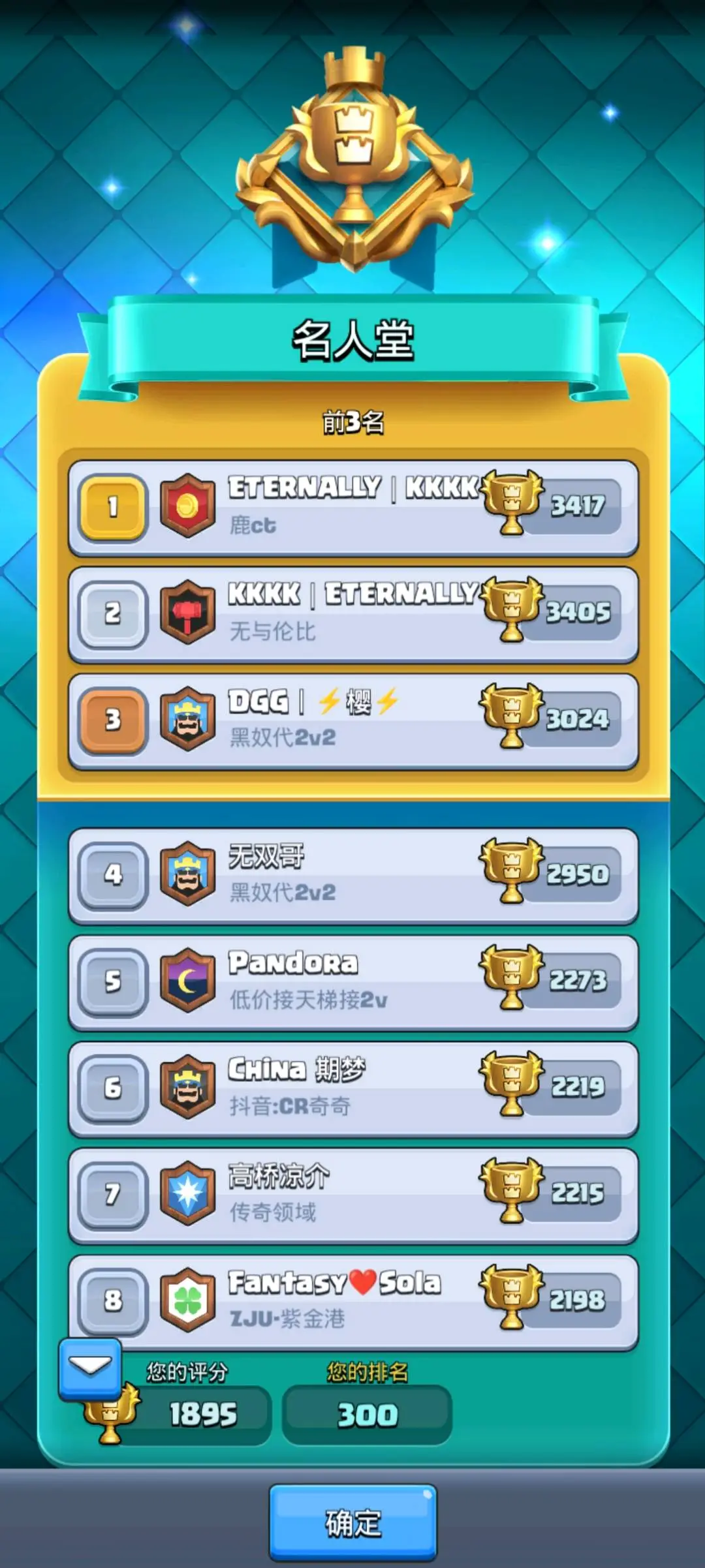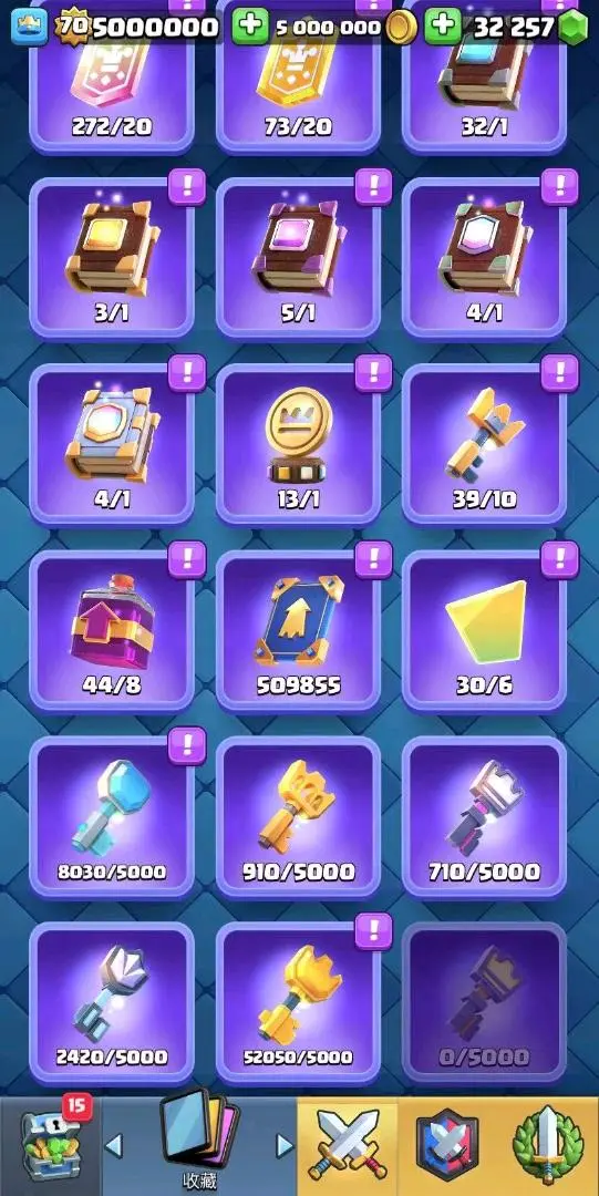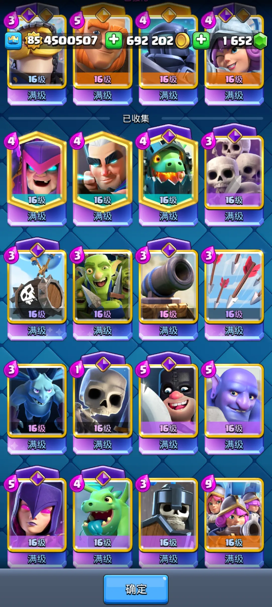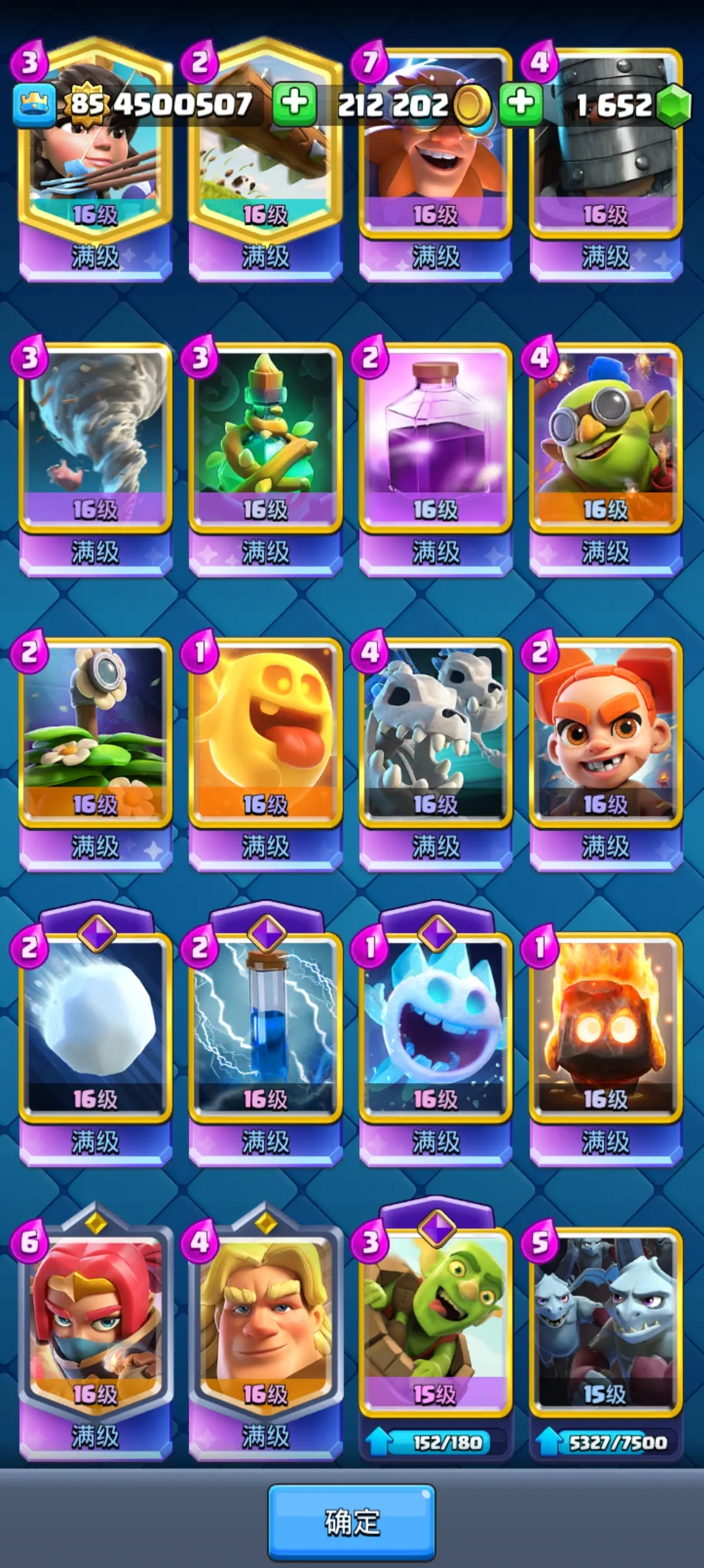 卡牌全16级满级,解锁全部觉醒卡,精英卡,所有卡金皮肤全满,有满级厨师塔,刀塔,炮塔,公主塔,新赛季钻石令牌,还有超多稀有表情,超多皇家塔皮肤,五百万金星点,五百万金币,三万多钻石,国服NO.1部落长老,经典挑战勋章,锦标赛,天梯五百名勋章都有~