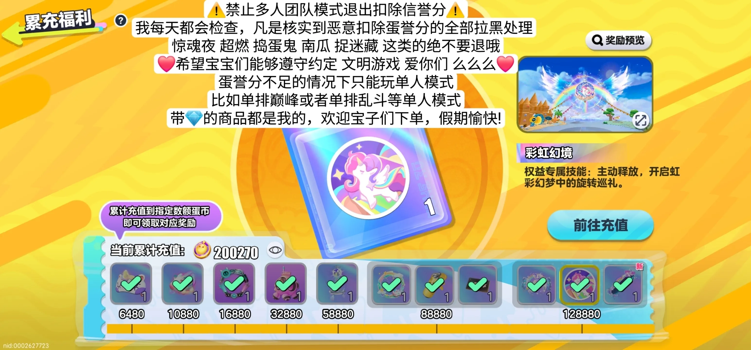 蛋仔派对,黎月园长,蔷薇红皇后,断罪骑士-极,圣翼天使-澄,暗匿小丑,蔷薇红皇后,音爆曜星,星际莱克,醒狮蛋宝,艾瑞和巴蒂,惑心小丑,欢宴园长,蔷薇白皇后,玉龙云岫,断罪骑士-岚,断罪骑士-烈,猎罪修罗-樱,猎罪修罗-溟,圣翼天使-恋,圣翼天使-堕,透明蓝帽,甜酷阿莉,织梦精灵,冰霜骑士,水母莱莱,小蓝帽,清姬樱子,深海灏克,胆小鬼,木偶波露,蟹船长,黑森麦克,月影摇摇兔、仙舞飘飘鹿、透明蓝帽、机甲、浪花戴露姗、小羊、兔兔车、白皇后、懒羊羊、鲨莉娃、砂糖熊王子,佣兵,杰克,赵云,园丁,橙留香,梅海海,铃兰三月兔,焰心龙女芙瑞,曙光龙女芙瑞,翠羽之屏,闪电护目镜、古早,极真阿莉,无敌凤凰,超级凤凰,许愿币,彩虹币,龙车,兔车,鹿车,至臻滚动特效,大机甲,大佬,单字ID,单字,土豪,马车,神豪,雪影极光羽,鱼龙舞,游游白柳仙,桃花春晓,炽天使,圣域六翼,光辉,幽冥,永夜,翼起飞,百变羽翼,满氪,王者荣耀,和平精英,第五人格,元梦之星,火影忍者,手游Cf,穿越火线,无畏契约,三角洲行动,使命召唤手游,超自然行动组,逃出惊魂夜,松烟