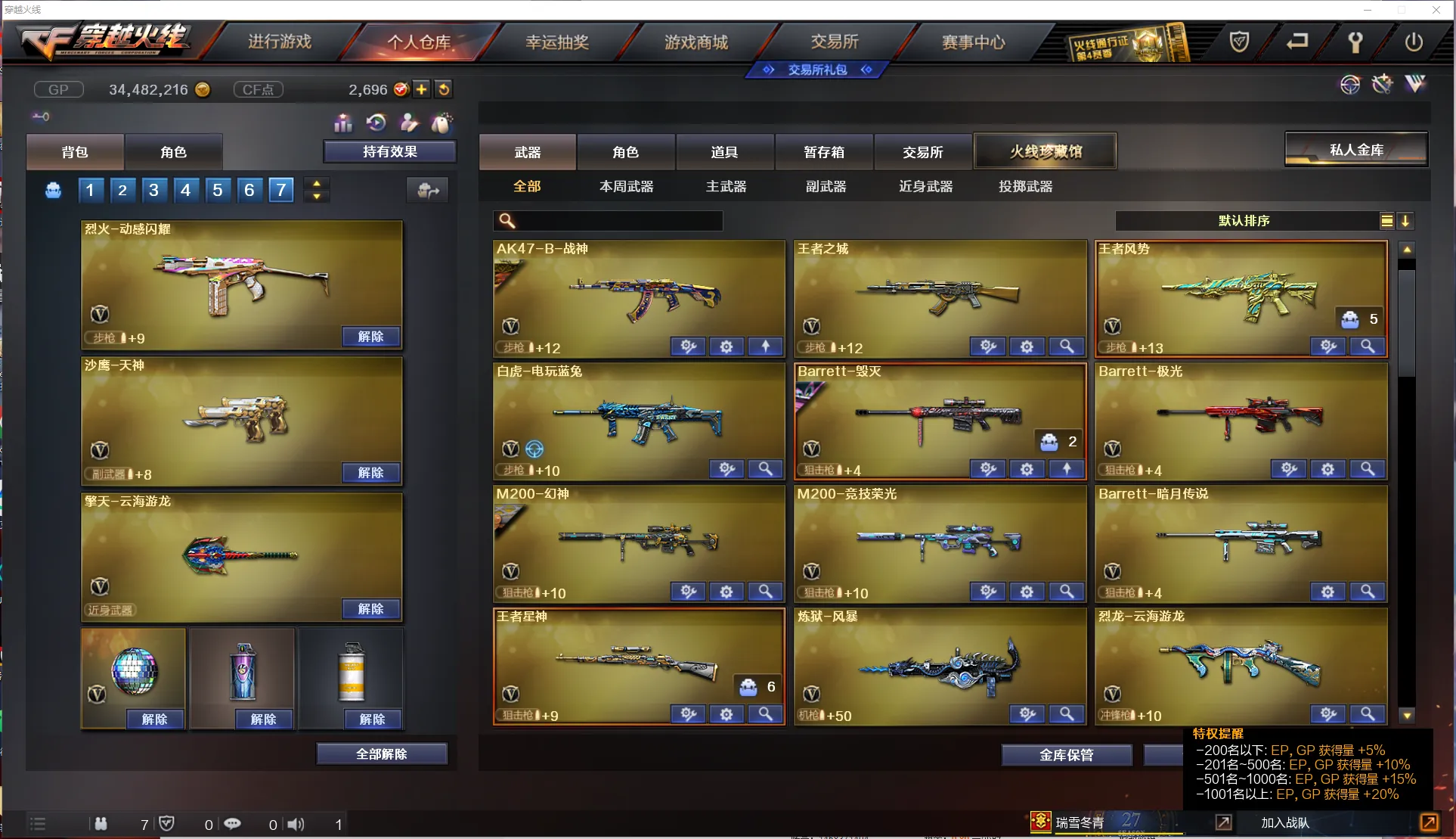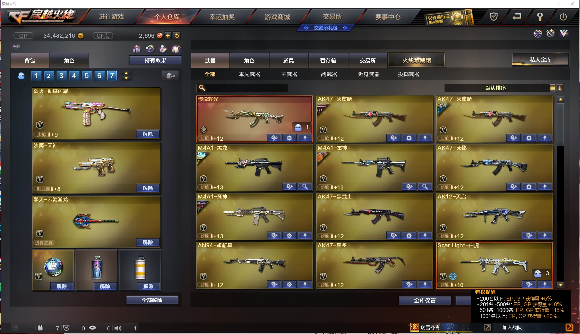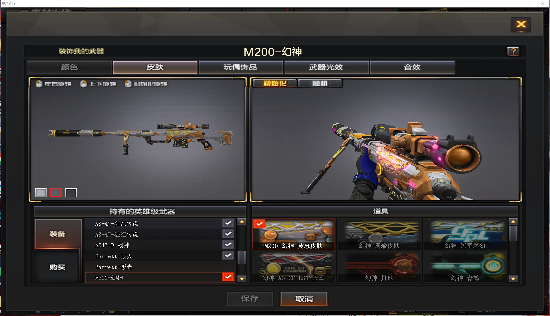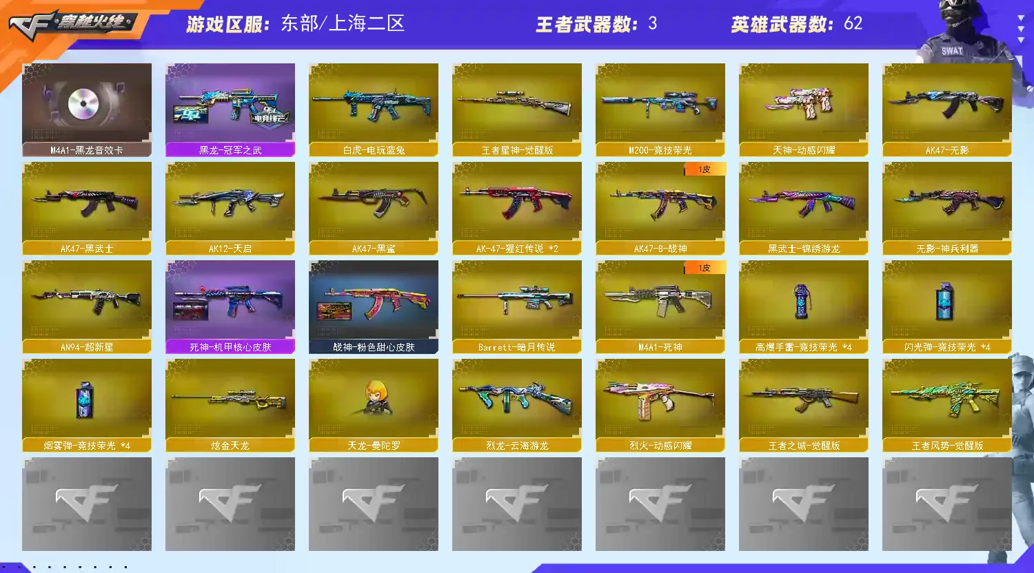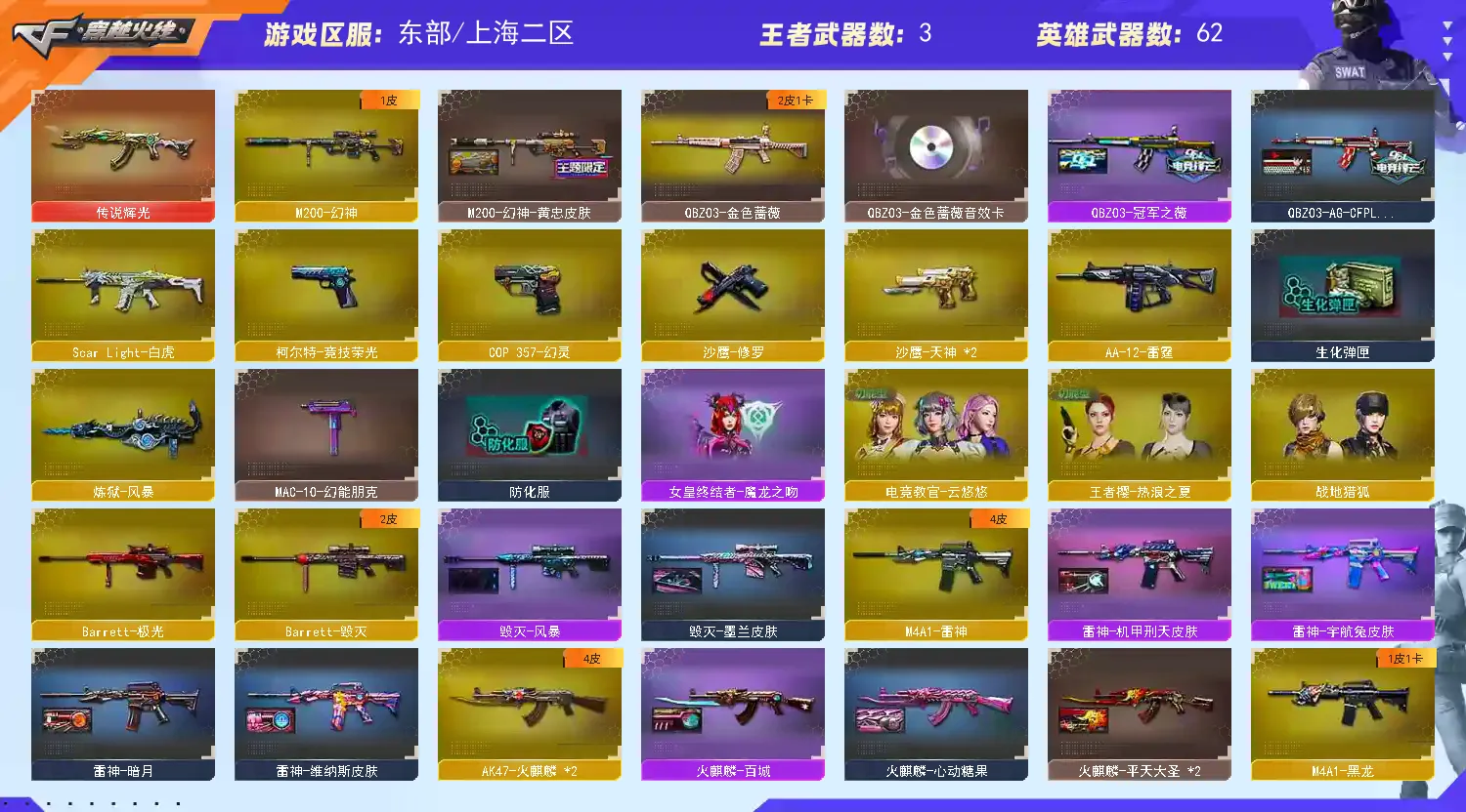 【主 武】:传说辉光、M200幻神(黄忠皮肤、动感闪耀音效卡)、M200竞技荣光、王者星神、Sar白虎、QZB金色蔷薇(冠军之微、AGS19冠军)、白虎电玩蓝兔、王者风势、王者之城、炫金天龙、火麒麟X2、黑龙(冠军之武)、雷神、无影、死神、黑武士、天启、超新星、黑鲨、无影神兵利器、烈火动感闪耀、烈火、猩红传说X2、战神、毁灭、极光、暗月传说、炼狱风暴、烈龙云海游龙、AA12雷霆、毁灭征服者、冰龙粉碎者、机甲撕裂者、激光毁灭者、圣炎切割者、深渊巨龙咆哮、神圣爆裂者、试炼破坏者、苍雷、金魔等各种活动武器