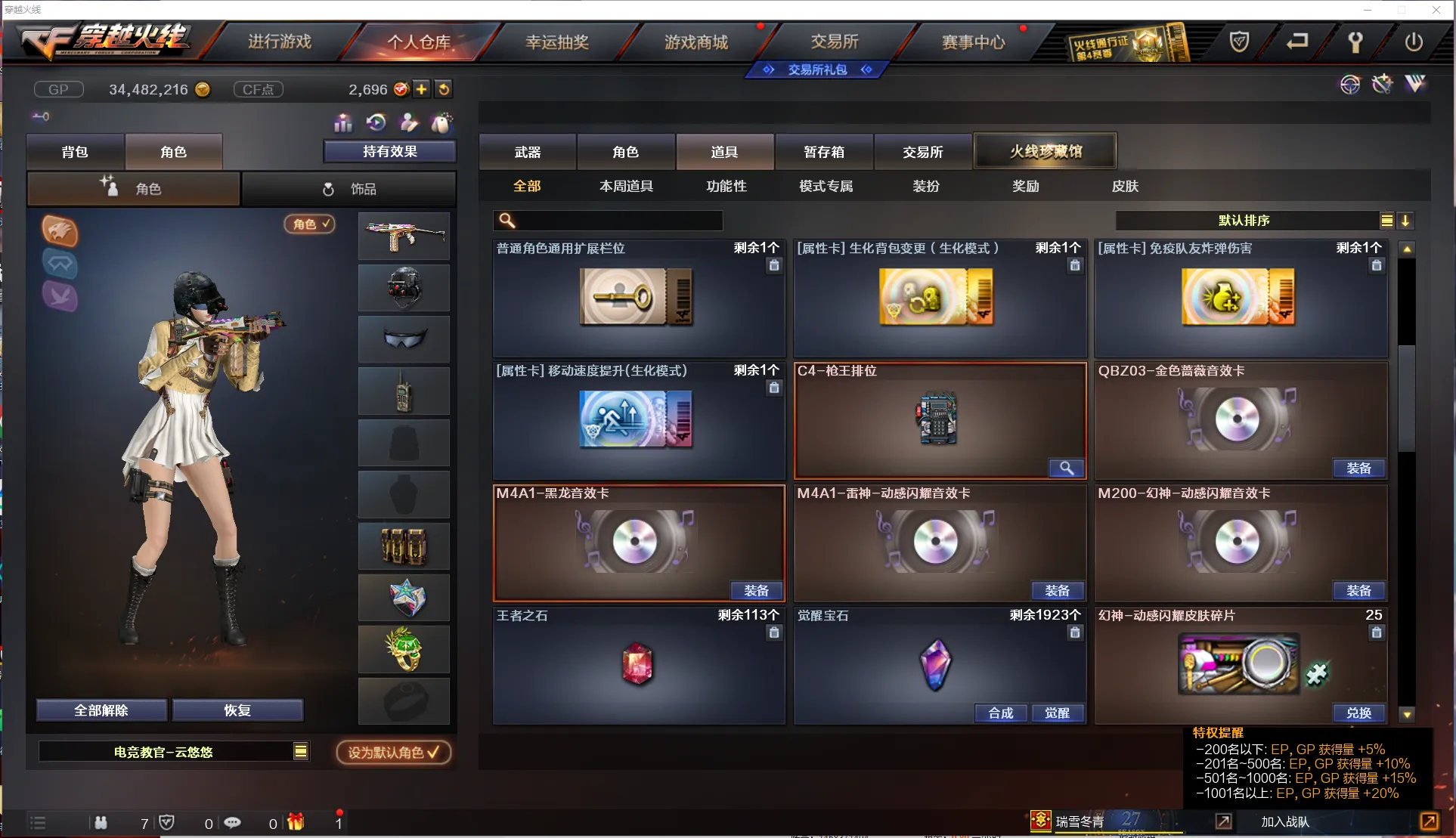 【道 具】:幻神动感闪耀音效卡、雷神动感闪耀音效卡、金色蔷薇音效卡、黑龙音效卡、乔伊教练玩偶、三国吴国玩偶、CFS纪念玩偶、小红玩偶、悦动玩偶、7个背包、AC(防弹衣+防弹头盔)、C4工具钳、手雷包、挑战弹夹、夺命之镰、变异宝贝、灵魂忍者、生化弹夹、防化服、机枪弹夹、冲锋枪弹夹、散弹枪弹夹、手枪弹夹、狙击枪弹夹、步枪弹夹、减少停顿包