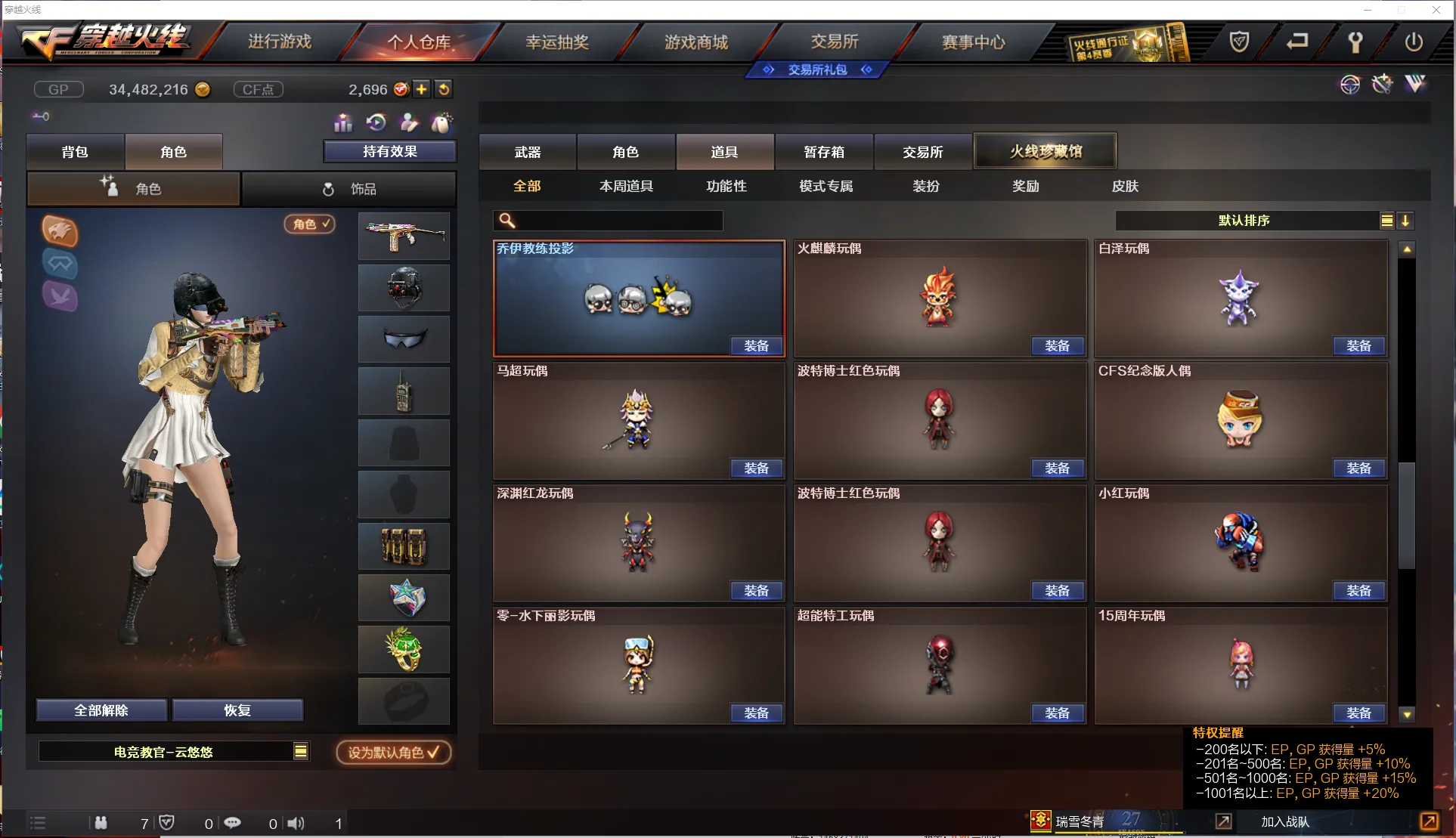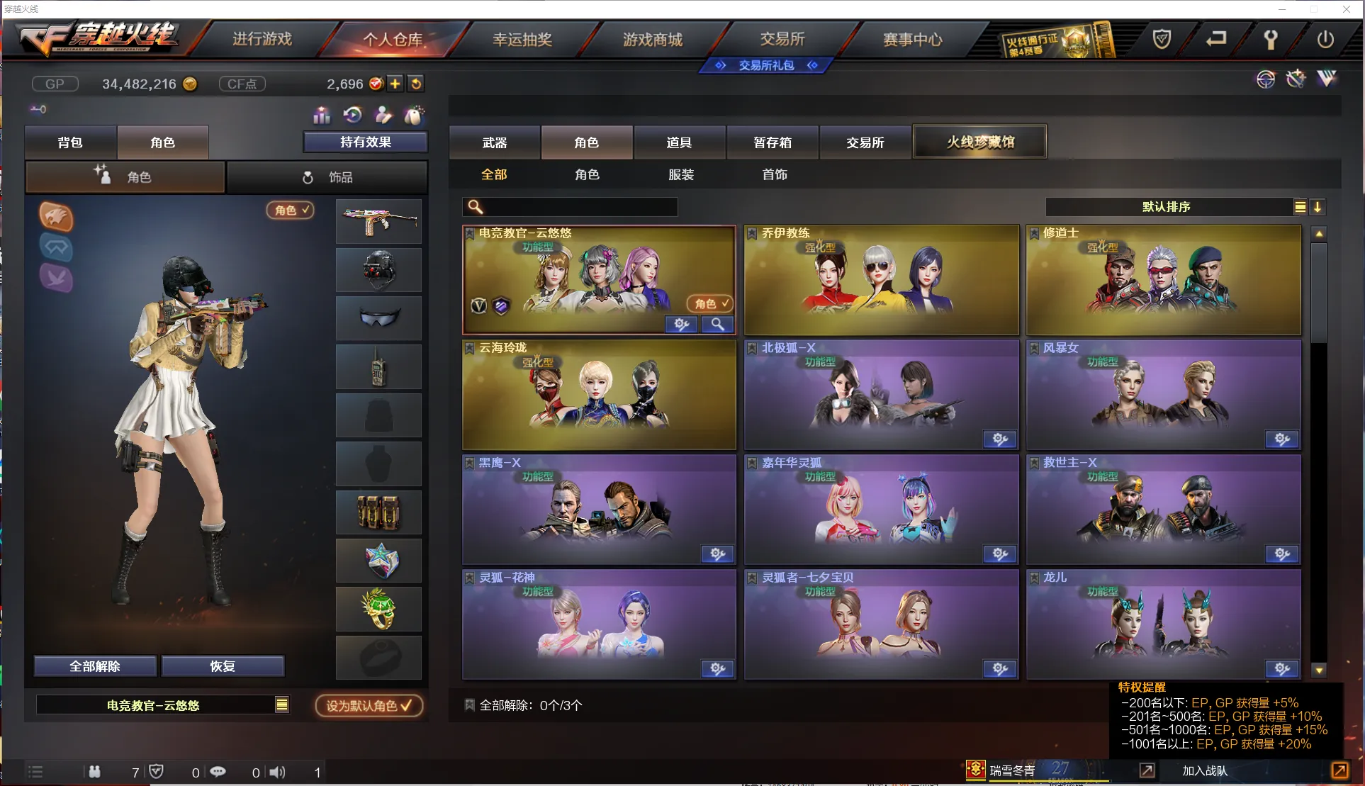 【角 色】:电竞教官云悠悠、乔伊教练、修道士、云海玲珑、风暴女、救世主-X、蜀雪、铁骑荣耀、影舞者-X、8周年戒指、双蛇戒指、双龙戒指