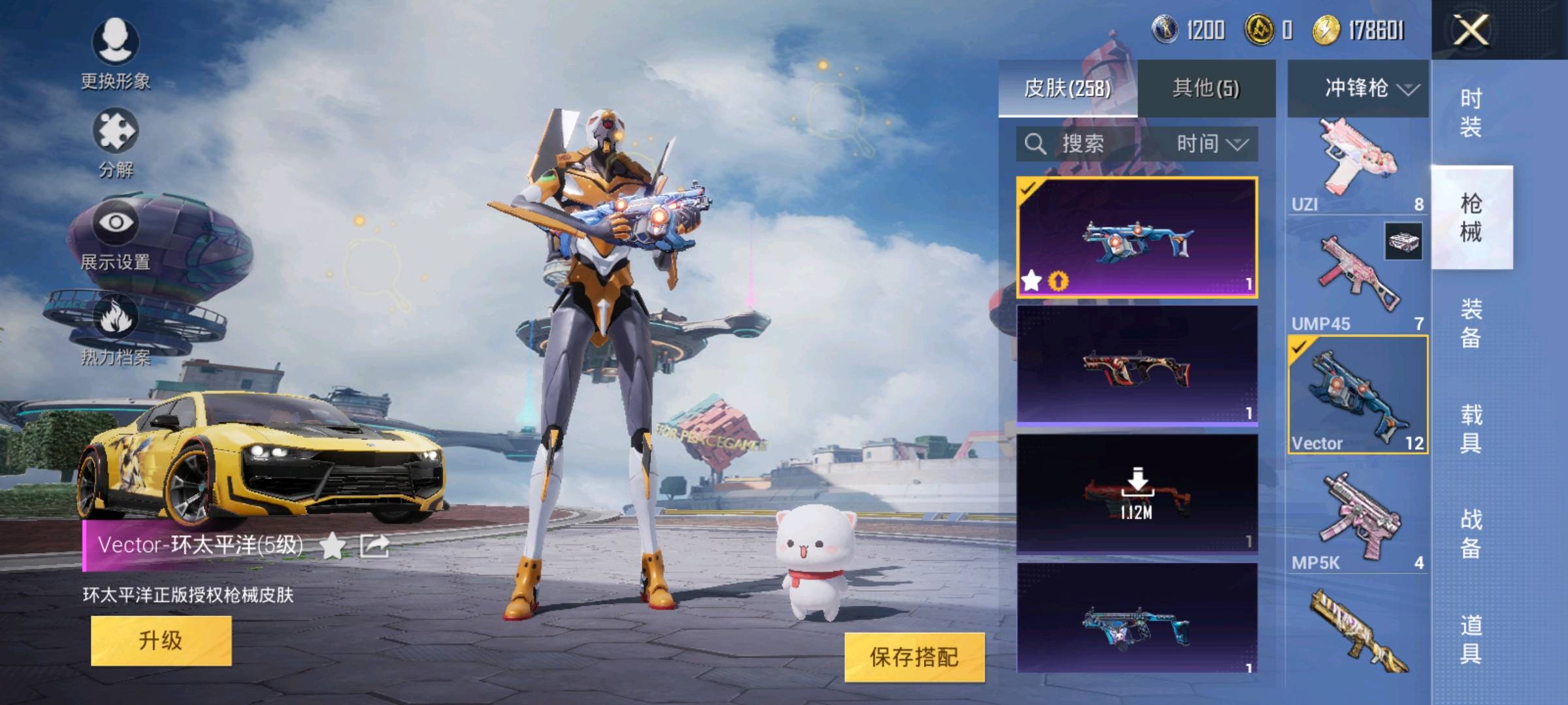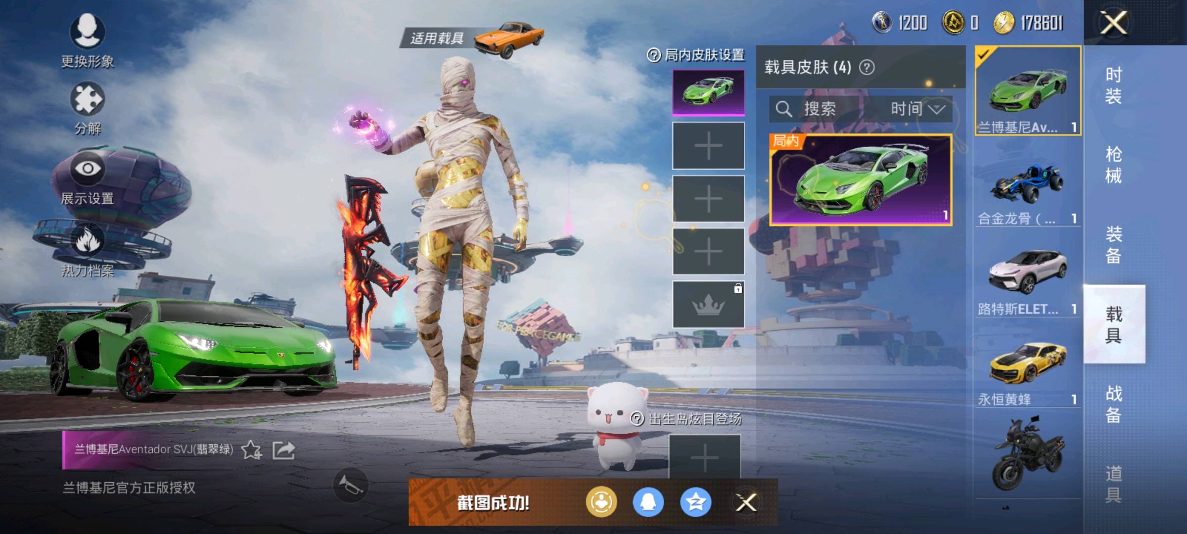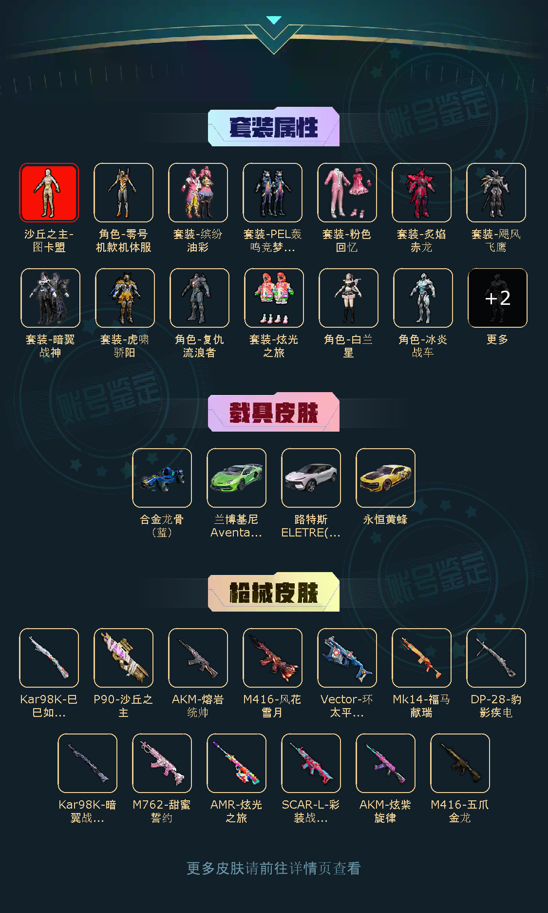 15粉,4载具,213套装,M416-风花雪月/M416-五爪金龙/AMR-炫光之旅/AKM-炫紫旋律/Vector-环太平洋/SCAR-L-彩装战姬/Kar98K-暗翼战神/M762-甜蜜誓约/P90-沙丘之主/AKM-熔岩统帅/兰博基尼Aventador(翡翠绿)/永恒黄蜂/合金龙骨(蓝)/路特斯ELETRE(花绽灰)/