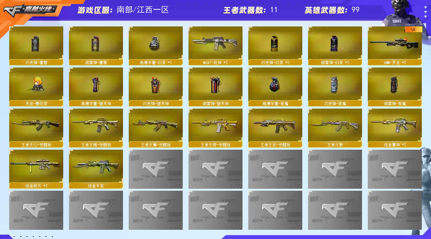 【其他重要武器】炫金千变/炫金雷神(2)/炫金毁灭(2)/M4A1-十二生肖·龙-雷神/腐蚀激光-超越MAX/黑武士-能量核心(2)/火麒麟-能量核心/冰龙粉碎者-白马银枪/激光毁灭者III-白马银枪/机甲撕裂者III/AK47-娜塔莎/AK47-枪娘/AK47-狂欢-CFS/火麒麟-桃园结义/AK47-破空冰刃/M4A1-战龙/9A91-2017万圣节(2)/M4A1-破空冰刃/M4A1-肯德基/黄金AK-47(2)/M4A1-电音(2)/M14EBR-赤血龙魂/AK47-死亡之翼(2)/AK47-B-十周年/AN94-凤凰/凤凰之魄/AK12-枪王排位/AK47-万圣节2018/M4A1-S-火种/AK47-SS/AK47-苍龙/AK47-轮回/M4A1-紫狱(2)/M14EBR-情人节2020/M4A1-S-能量核心/AK47-盛典-CFS 2022/AK47-丹龙/M4A1-秘银赤龙(2)/百城AK47/M4A1枪王排位II/AK47-齐天大圣/G3A3-SS-枪王排位/红龙AK47/AK-47-二次元/AK47-朋克/AK103-神秘黑洞/AWM-恶棍-枪王排位(2)/M200-圣诞/AWM-恶棍/AWM-万圣节刀锋/AWM-S/M200-赤血龙魂/M200-万圣节/AWM-Pink/凤凰之力(4)/AWM-十周年/AWM-小故障/AWM-涂鸦/M200-萌杀/AWM-盛典-CFS 2022/M200-大黄蜂/AWM-摸金校尉/AWM-A枪王排位II/98K-火线13周年/AWM-蓝水晶/火狱乱世-超越Max/EVO III-赤血龙魂/EVO3A1-火线13周年(2)/EVOIII- 曹操/试炼破坏者III/征服者-毁灭之王 [Lv Max]/SPAS-12-雷电核心/COP 357--绚樱/幻影沙鹰-枪王排位/凤凰之火/沙鹰-枪王排位(3)/沙鹰-万圣节2018/COP 357-平天大圣/沙鹰-能量核心(2)/新USP-枪王排位奖励(4)/Cop357-赤龙/COP357-朋克/毛瑟-庆典-CFS 2021/COP-金蝉子-枪王排位/柯尔特-百城/金刚伞-电玩红兔/军用铁锹-飞龙在天/鹰爪-枪王排位(2)/收割者-枪王排位/丛林匕首-枪王排位/雷神之怒-机甲核心/幻影双斧-枪王排位/尼泊尔-庆典-CFS 2021/虹光丛林匕首-枪王排位/胜利奖杯闪光弹-枪王排位(2)/胜利奖杯烟雾弹-枪王排位(3)/闪光弹-枪王排位(5)/胜利奖杯手雷-枪王排位(2)