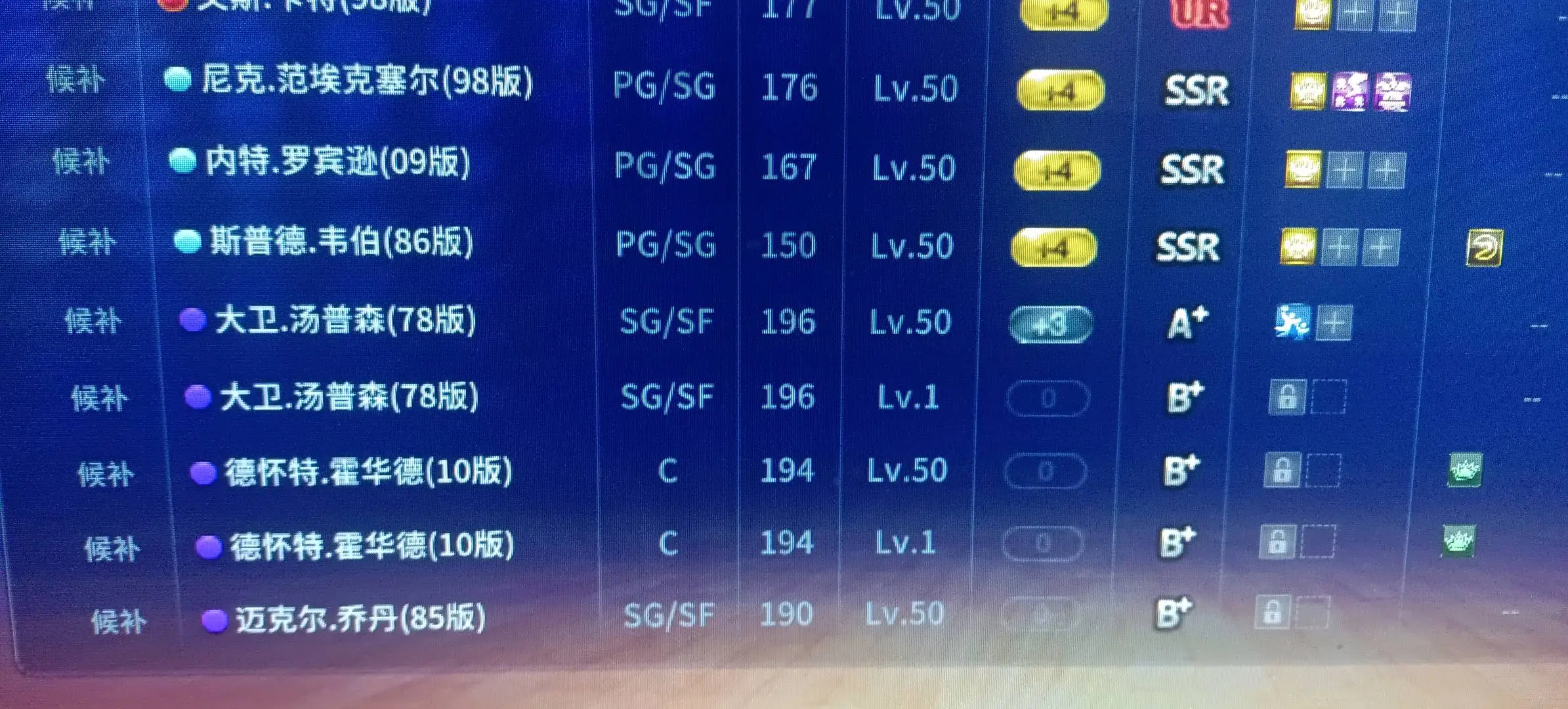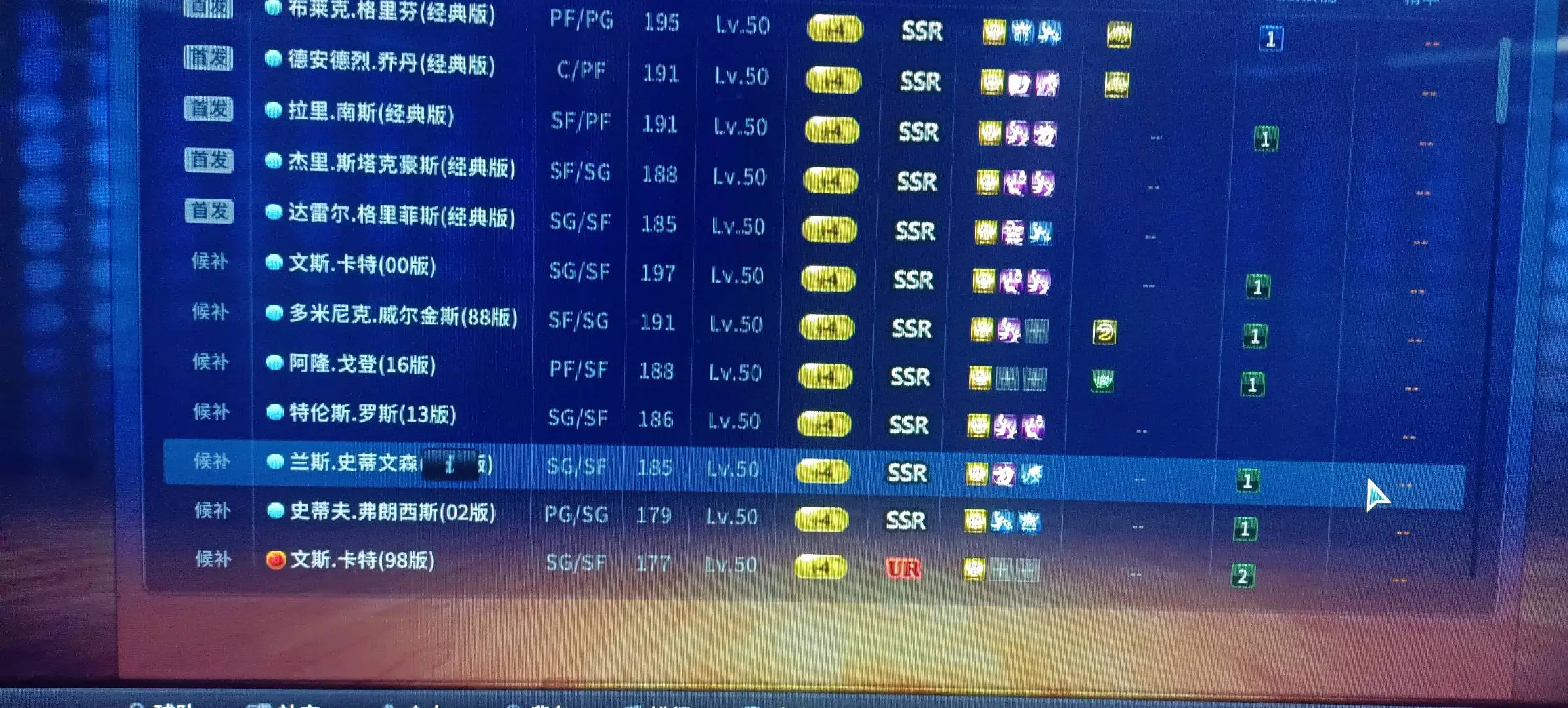 (SSR经典欧文、洛城内线双子星满羁绊、SSR南斯经典版、SSR豪斯经典版、SSR00卡特、SSR13罗斯、SSR格里菲斯、SSR吉尔摩尔、SSR巴恩斯、SSR经典师弟、SSR小土豆、SSR鹰队kou篮王羁绊、魔术飞人羁绊等)