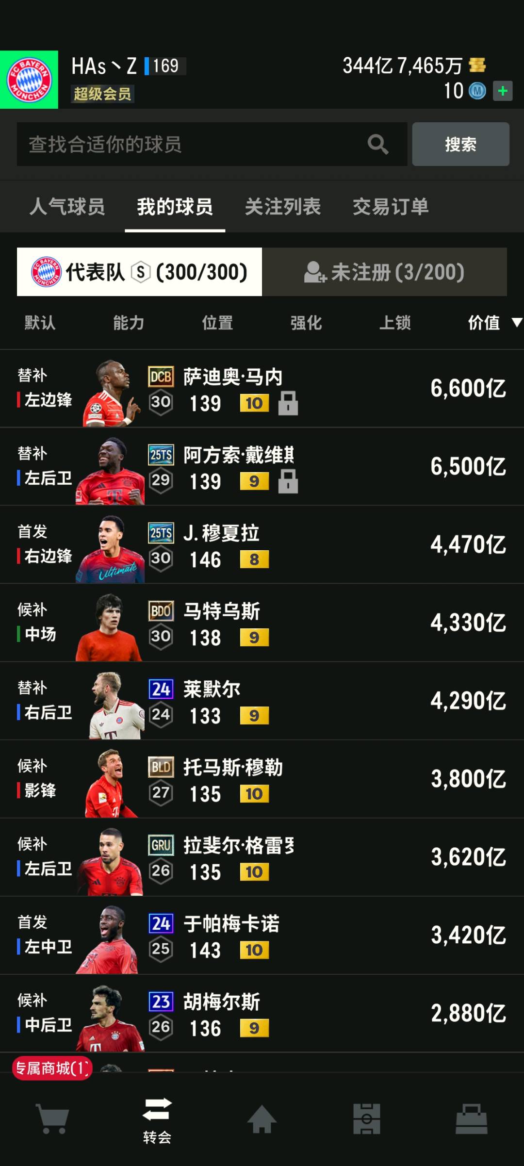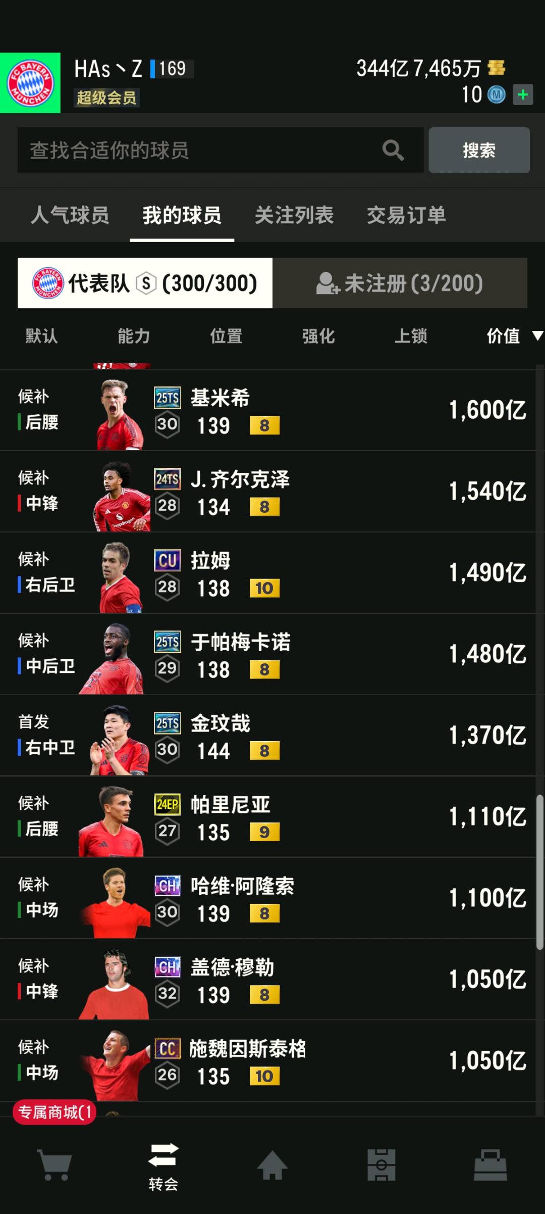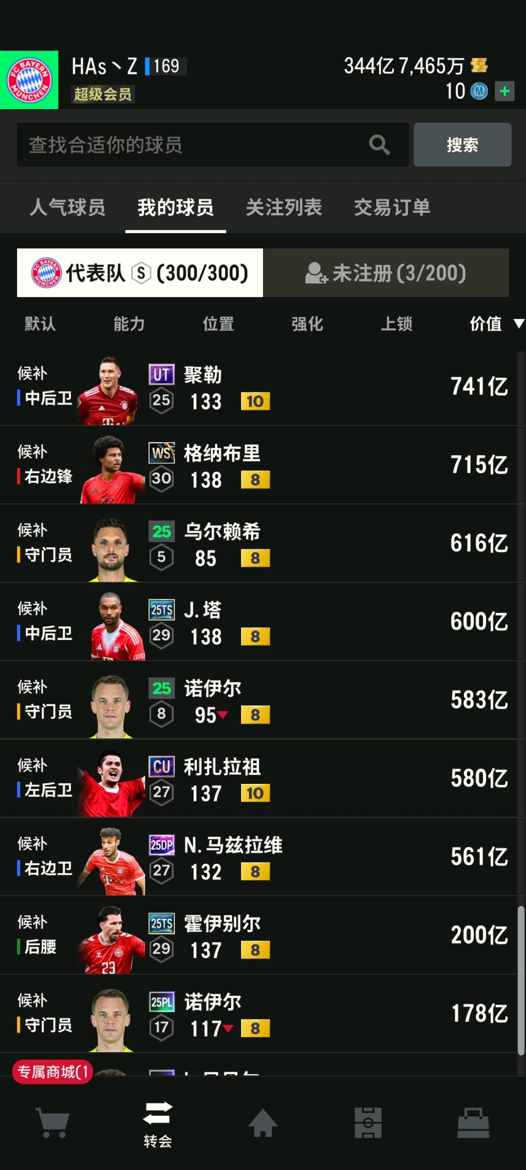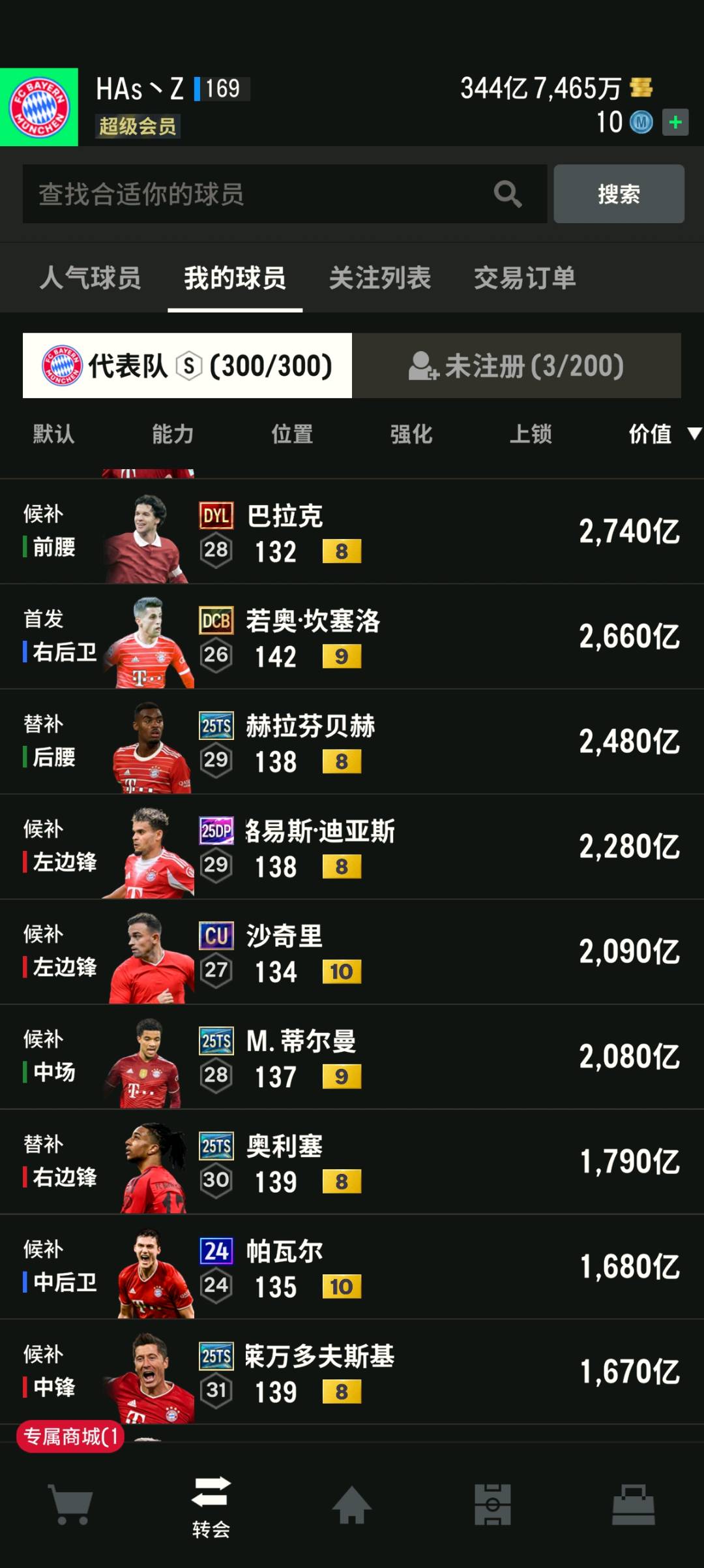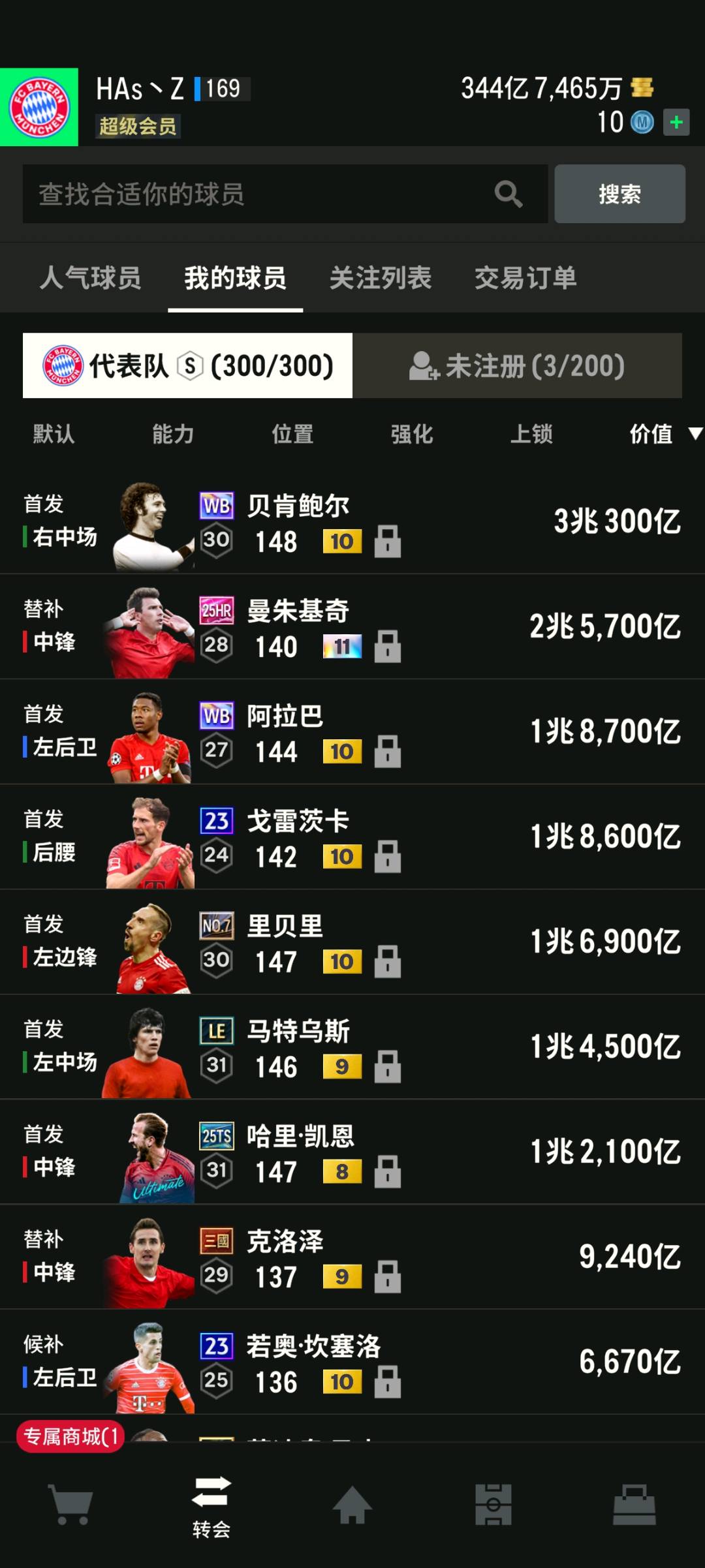 价值22兆极品拜仁套。多张10卡,25TS凯恩,11曼朱,10贝皇等。登录密码1007