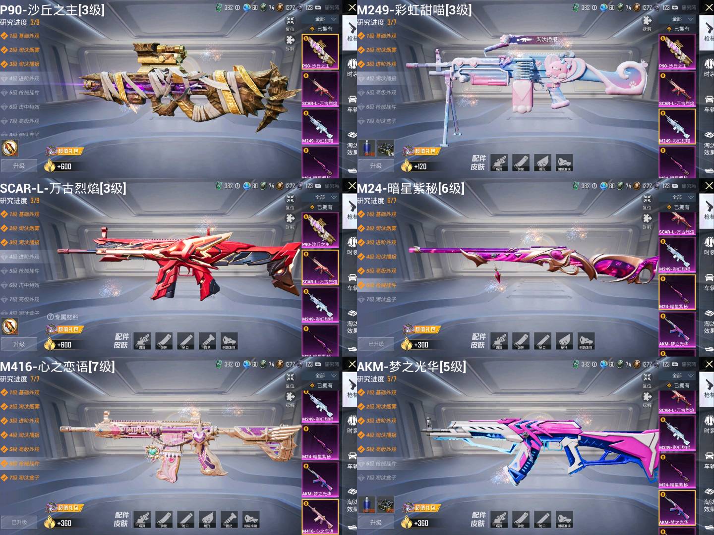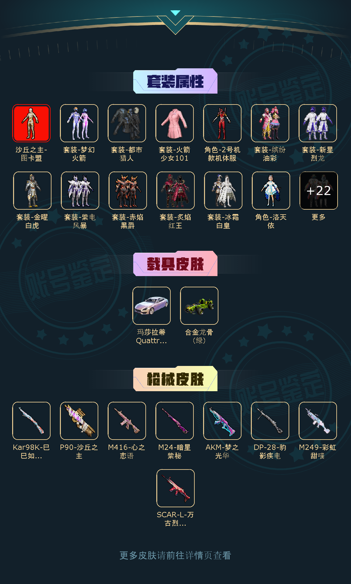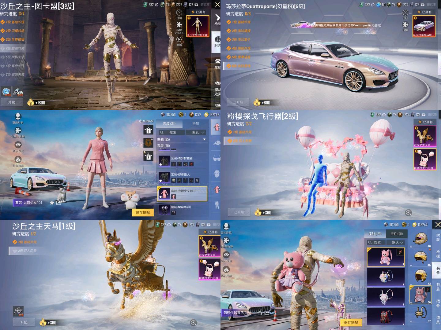 33粉,2载具,211套装,M249-彩虹甜喵/M416-心之恋语/M24-暗星紫秘/SCAR-L-万古烈焰/P90-沙丘之主/AKM-梦之光华/合金龙骨(绿)/玛莎拉蒂Quattroporte幻星粉/