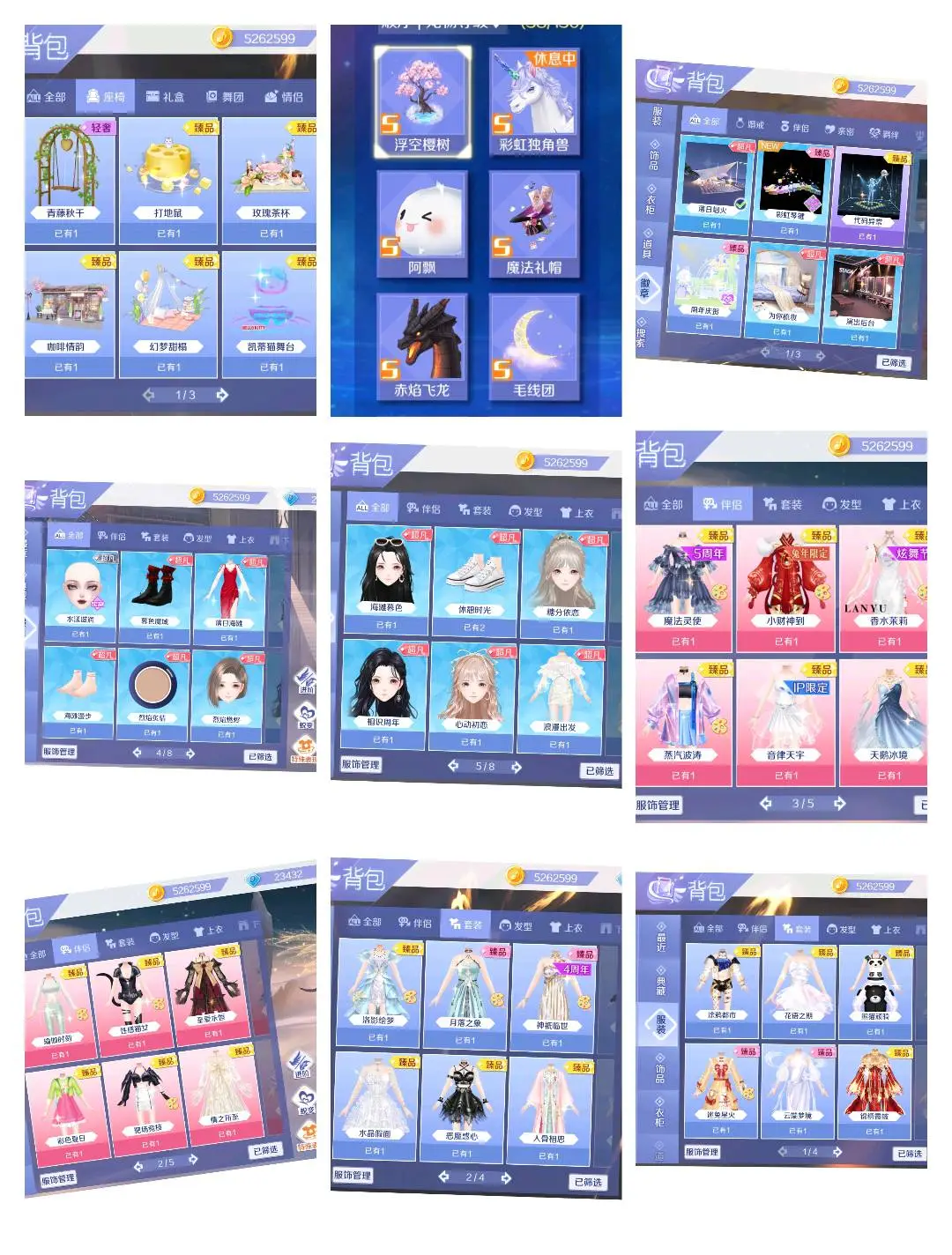有一件稀世,两件超凡衣服,多件臻品衣服,多个座骑,徽章
