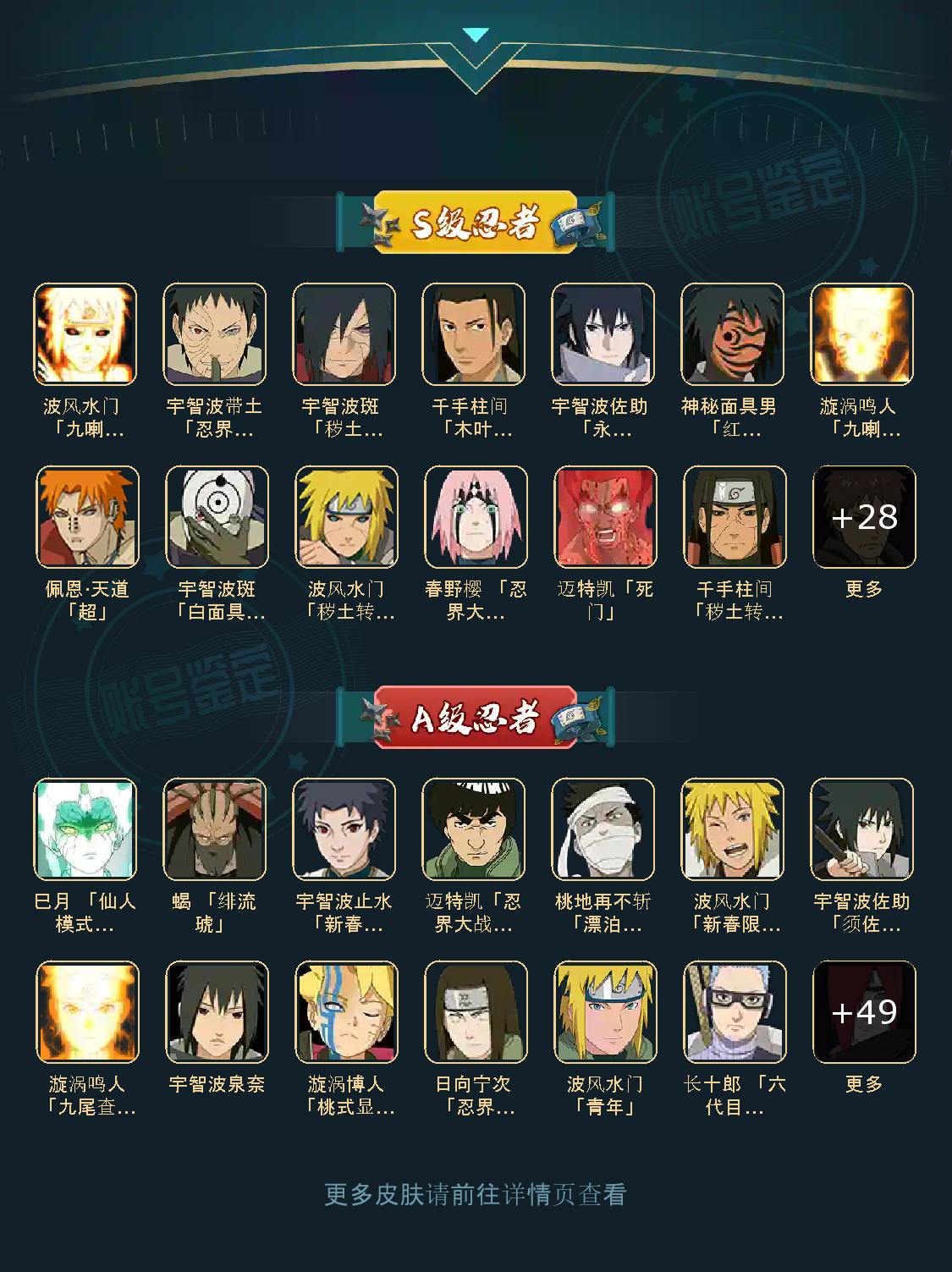 【40S忍者55A忍者1872W战力-12高招券】纲手 日斩 大蛇丸 水门 九喇嘛鸣人 永恒佐助 自来也 仙人自来也 舞杰自来也 百豪纲手 s门凯 秽土水门 秽土日斩 秽土扉间