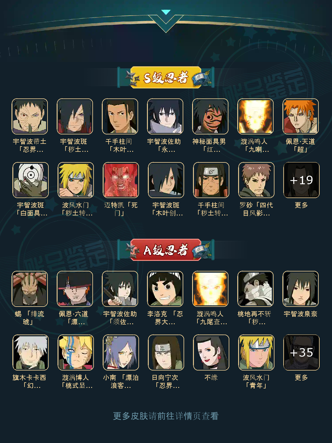 S忍32个;A忍41个,通灵兽21个,S忍:普通纲手猿飞日斩大蛇丸九喇嘛鸣人永恒万花筒佐助仙人自来也百豪纲手死门凯普通自来也豪杰自来也波风水门秽土水门秽土猿飞秽土扉间千手柱间秽土柱间木叶创立柱间秽土斑木叶创立斑秽土解斑须...