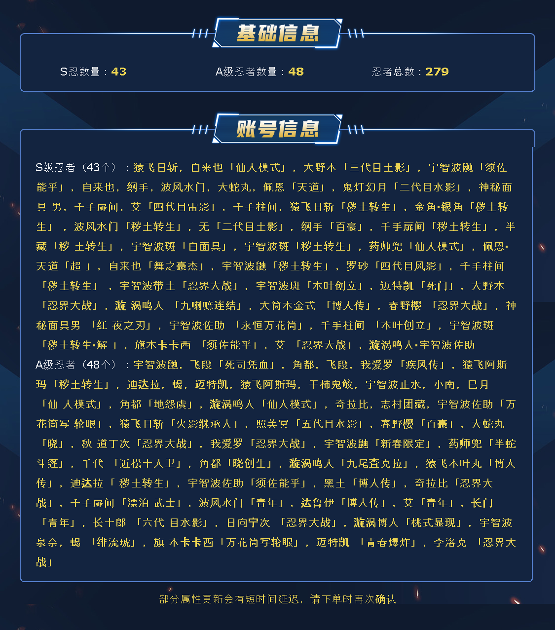 VIP11级;S忍41个;A忍42个,通灵兽20个,S忍:猿飞日斩大蛇丸普通纲手九喇嘛鸣人永恒万花筒佐助忍战樱仙人自来也百豪纲手普通自来也豪杰自来也死门凯波风水门秽土水门秽土猿飞千手扉间秽土扉间千手柱间秽土柱间木叶创立柱...
