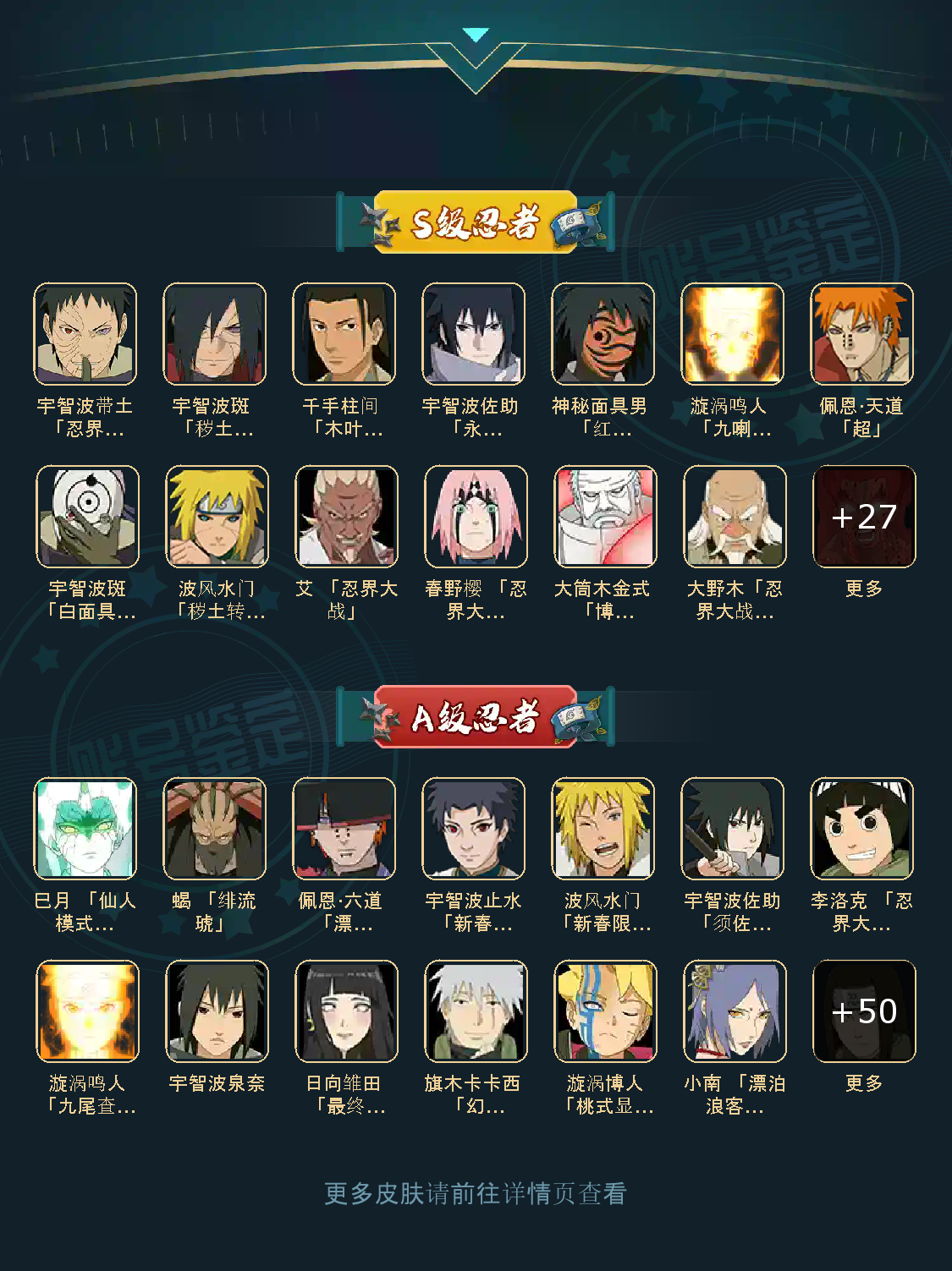 战力:1665W+;VIP13级;S忍38个;A忍56个,通灵兽22个,S忍:大蛇丸普通纲手波风水门猿飞日斩九喇嘛鸣人永恒万花筒佐助忍战樱百豪纲手普通自来也豪杰自来也死门凯秽土水门秽土猿飞千手扉间秽土扉间千手柱间秽土柱间木叶创立柱间宇智波斑