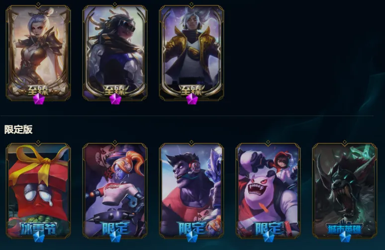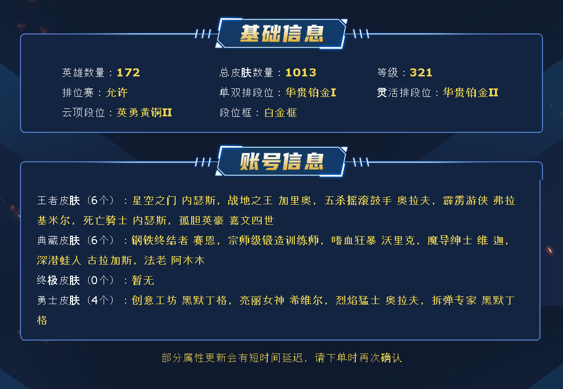【全英雄可排位683原皮肤】至臻锐雯、至臻瑟提、至臻石头人、至臻佐伊、至臻盖伦、至臻剑魔、至臻亚索、殿堂传奇妖姬、水晶掠夺者卡兹克、摄魂VN、海克斯卡萨丁、海克斯皇子、海克斯人马、龙瞎、玉剑传说劫、猪年薇恩、马年皎月、蛇年蛇女、狗年拉克丝、狗年狼人、电玩阿狸、电玩锐雯、龙琴、虎痴之拳、蛇年安妮、羊年金克丝、花木兰、猴年女警、猴年莫甘娜、魔女寡妇、灵能特工琴女、灵魂莲华阿狸、斩星**易、创星之灵璐璐、征服者韦鲁斯、玉剑传说琴女、魔女阿狸、幻执事妖姬、星之守护者艾克、古神狼人、古神艾翁、太空律动格温、幻灵战斗猫金克丝、山海绘卷妮蔻、女帝芮尔、灵能特工莎弥拉、灵能特工维克托、灵能特工劫、灵魂莲华千珏、屠龙勇士凯尔、万圣节艾克、电玩人马、情人节奎因、情人节霞、万圣节人马、泳池发条、御星魔矢、制胜金球、制胜金靴、暗星尊烬、奥德赛凯隐、黎明锐雯、律政大亨蒙多、神拳、星守阿狸、源计划薇恩、源计划寒冰、黯晶之眼、地狱火阿木木、黑潮吸血鬼、雷喵喵尔、喵凯、喵里克、千纸凤凰、未来战士艾克、小蜜蜂悠米、小蜜蜂大嘴、星守妮蔻、星守女枪、腥红之月卡特琳娜、玉剑剑圣、玉剑锐雯、源计划阿卡丽、战斗校长悠米、赵云