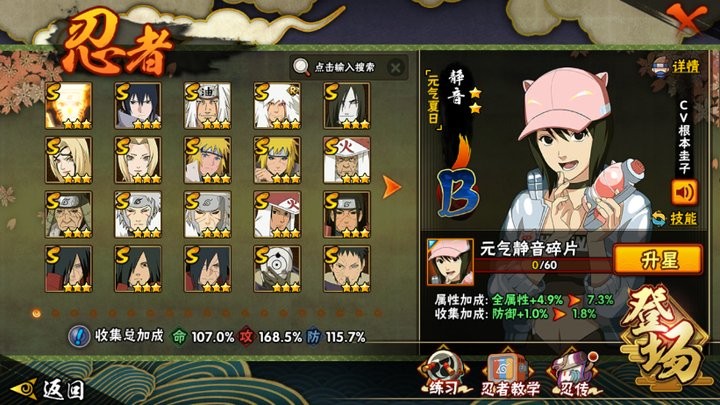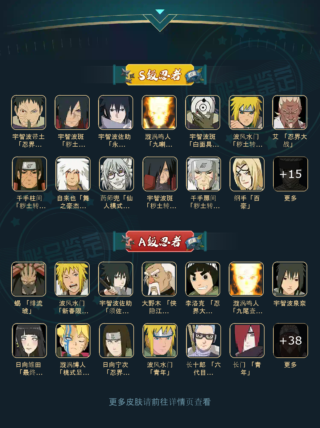 战力:1133W+;VIP11级;S忍24个;A忍46个,通灵兽20个,S忍:九喇嘛鸣人永恒万花筒佐助普通自来也豪杰自来也大蛇丸百豪纲手普通纲手波风水门秽土水门猿飞日斩秽土猿飞秽土扉间千手扉间千手柱间秽土柱间宇智波斑秽土斑秽土解斑白面具忍战