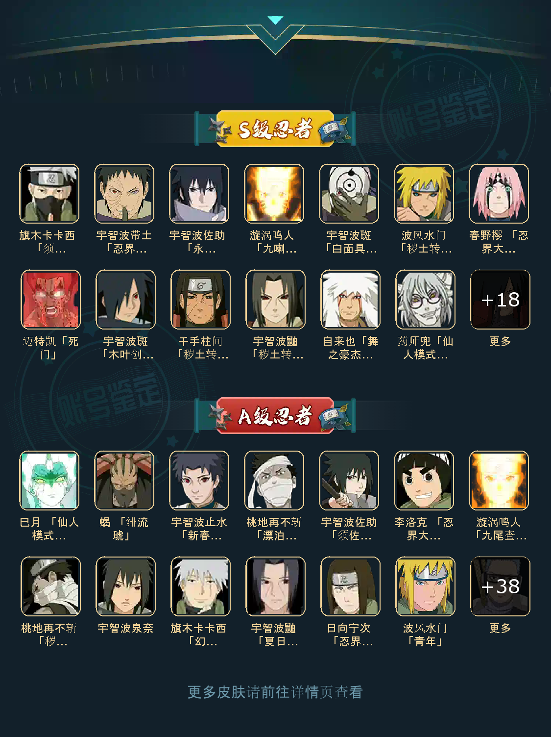 战力:1178W+;VIP10级;S忍30个;A忍40个,通灵兽19个,S忍:普通纲手猿飞日斩九喇嘛鸣人永恒万花筒佐助忍战樱仙人自来也大蛇丸百豪纲手普通自来也豪杰自来也死门凯波风水门秽土水门秽土猿飞秽土扉间千手扉间千手柱间秽土柱间秽土斑木叶