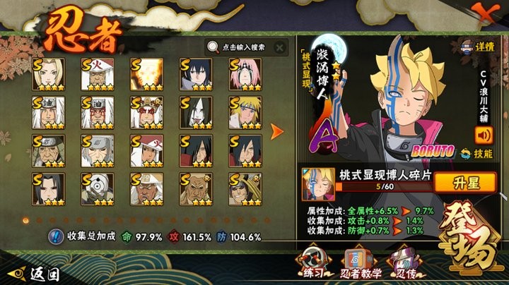 战力:1313W+;VIP12级;S忍26个;A忍37个,通灵兽21个,S忍:普通纲手猿飞日斩九喇嘛鸣人永恒万花筒佐助忍战樱仙人自来也大蛇丸波风水门普通自来也豪杰自来也秽土猿飞秽土扉间千手柱间秽土斑秽土解斑秽土鼬白面具四代艾三代艾金角银角忍