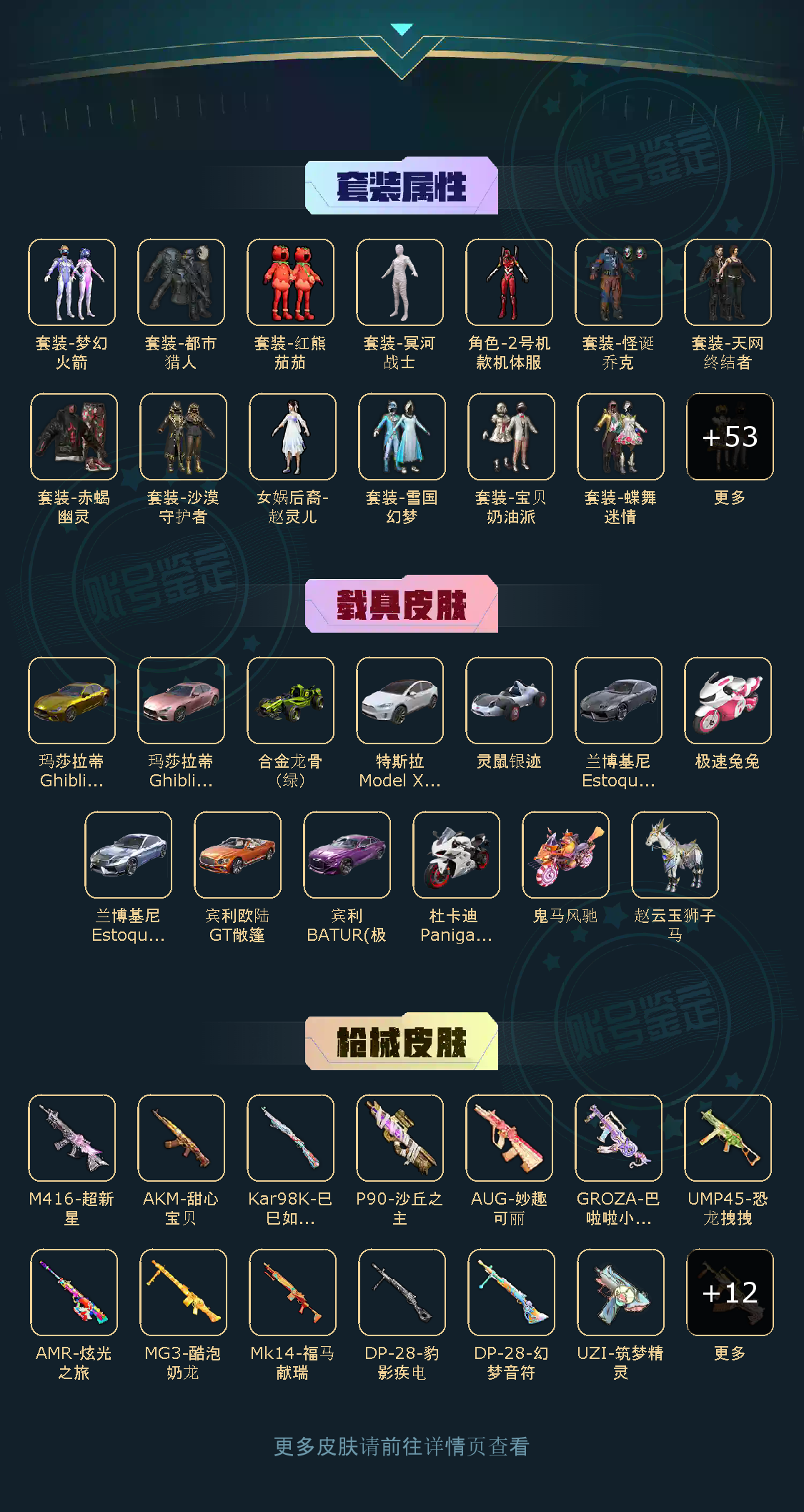 [特效枪22]:GROZA-巴啦啦小魔仙(7级) P90-沙丘之主(3级) DP-28-圣堂之誓(5级) SCAR-L-彩装战姬(1级) MG3-酷泡奶龙(5级) M416-超新星(4级) AMR-炫光之旅(5级) P90-粉樱探戈(7级) M417-第五大道(1级) DP-28-幻梦音符(1级) UMP45-恐龙拽拽(6级) UZI-筑梦精灵(4级) P90-甜蜜草莓(1级) AUG-妙趣可丽(7级) 汤姆逊-冰川粉黛(2级) M416-暖熊萌萌(4级) GROZA-焦糖拿铁(2级) AKM-甜心宝贝(6级) SCAR-L-童趣迷兔(7级) AKM-炫紫旋律(2级) M416-心之恋语(1级) M416-五爪金龙(1级)