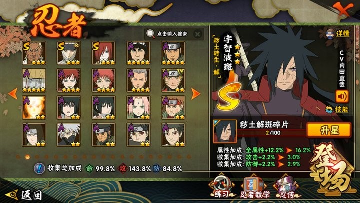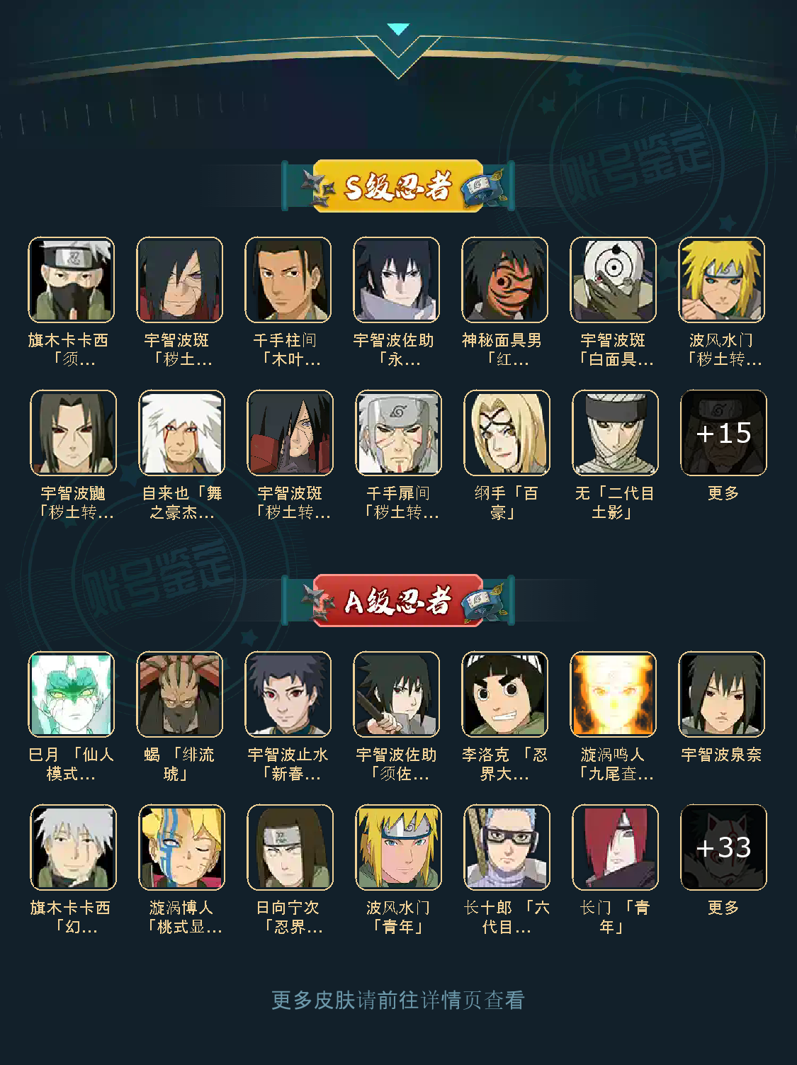 战力:1104W+;VIP11级;S忍23个;A忍37个,通灵兽18个,S忍:普通纲手永恒万花筒佐助普通自来也仙人自来也百豪纲手波风水门秽土水门猿飞日斩秽土猿飞秽土扉间千手柱间木叶创立柱间宇智波斑秽土斑秽土解斑秽土鼬神秘面具男白面具红夜面具
