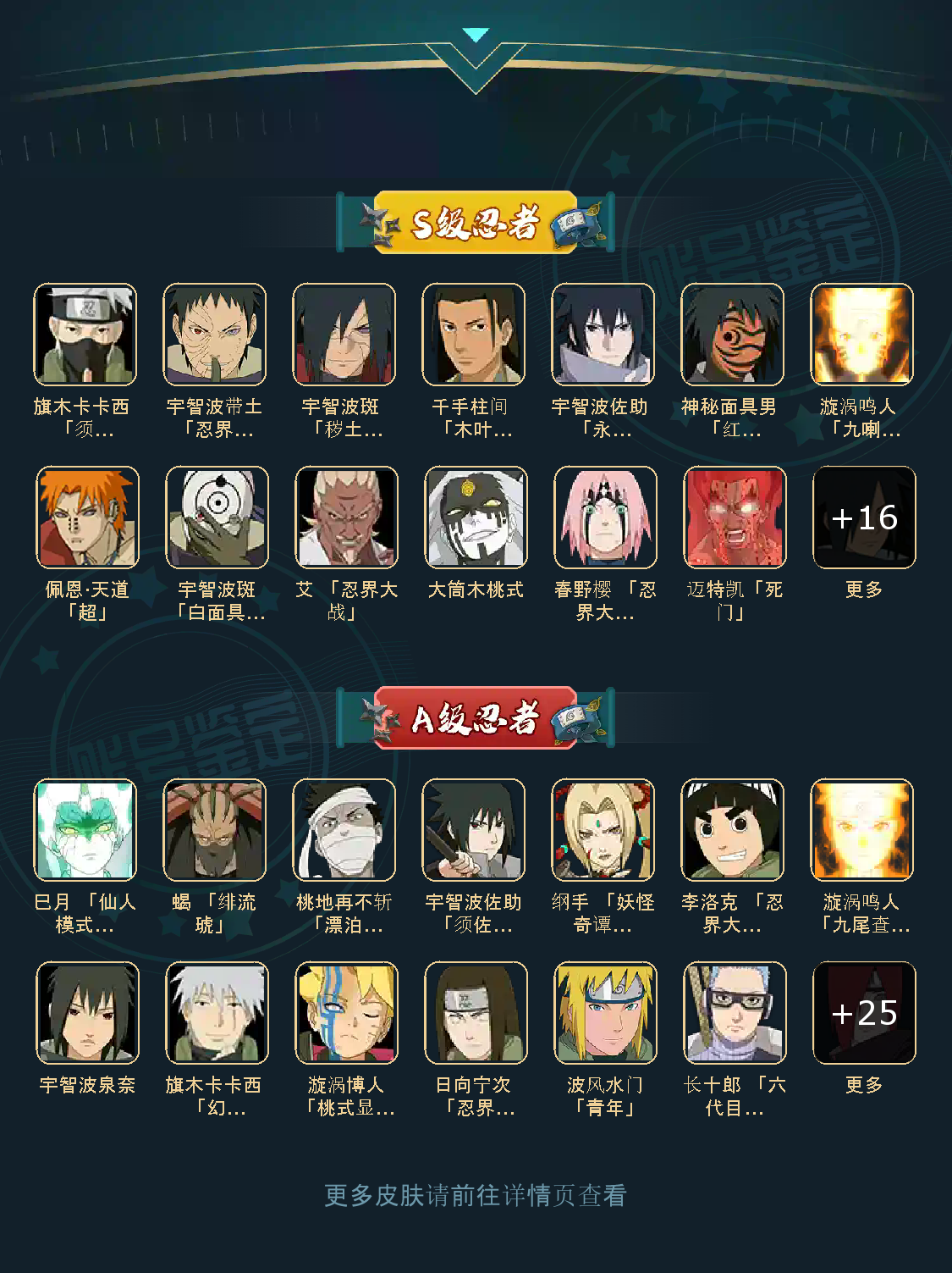 战力:1225W+;VIP11级;S忍25个;A忍30个,通灵兽18个,S忍:九喇嘛鸣人永恒万花筒佐助忍战樱豪杰自来也大蛇丸死门凯波风水门猿飞日斩秽土猿飞秽土柱间木叶创立柱间木叶创立斑秽土解斑秽土鼬白面具忍战带土红夜面具男罗砂鬼灯幻月忍界大