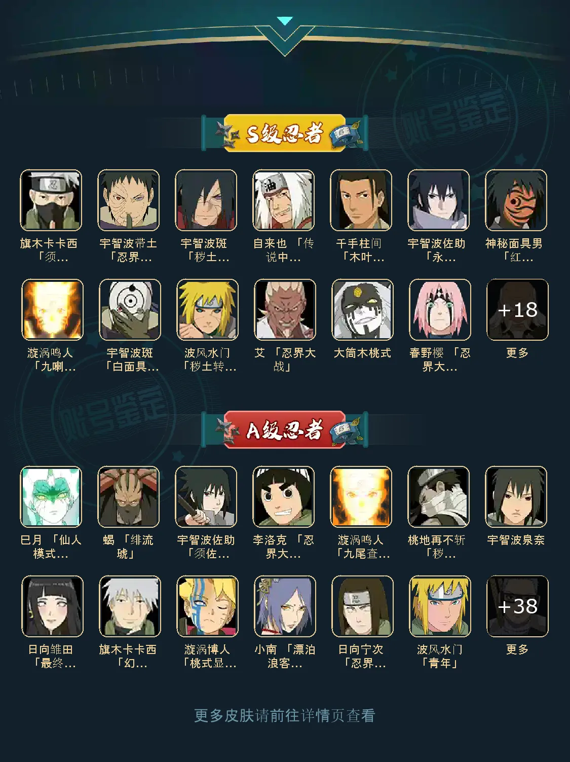 战力:1268W+;VIP11级;S忍27个;A忍42个,通灵兽18个,S忍:九喇嘛鸣人永恒万花筒佐助忍战樱普通自来也豪杰自来也大蛇丸普通纲手百豪纲手波风水门秽土水门秽土猿飞秽土柱间木叶创立柱间秽土斑秽土解斑秽土鼬白面具忍战带土红夜面具男三