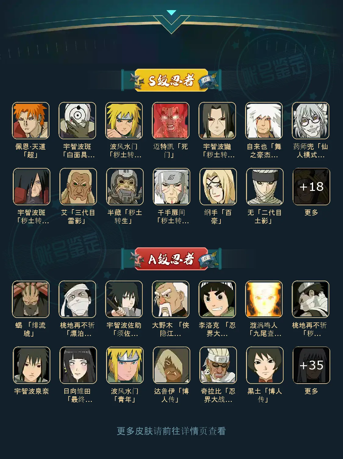 战力:1416W+;VIP12级;S忍31个;A忍37个,通灵兽20个,S忍:普通自来也普通纲手猿飞日斩千手扉间仙人自来也大蛇丸百豪纲手波风水门秽土水门豪杰自来也秽土猿飞秽土扉间千手柱间宇智波斑秽土斑须佐鼬秽土鼬神秘面具男白面具鬼灯幻月四代