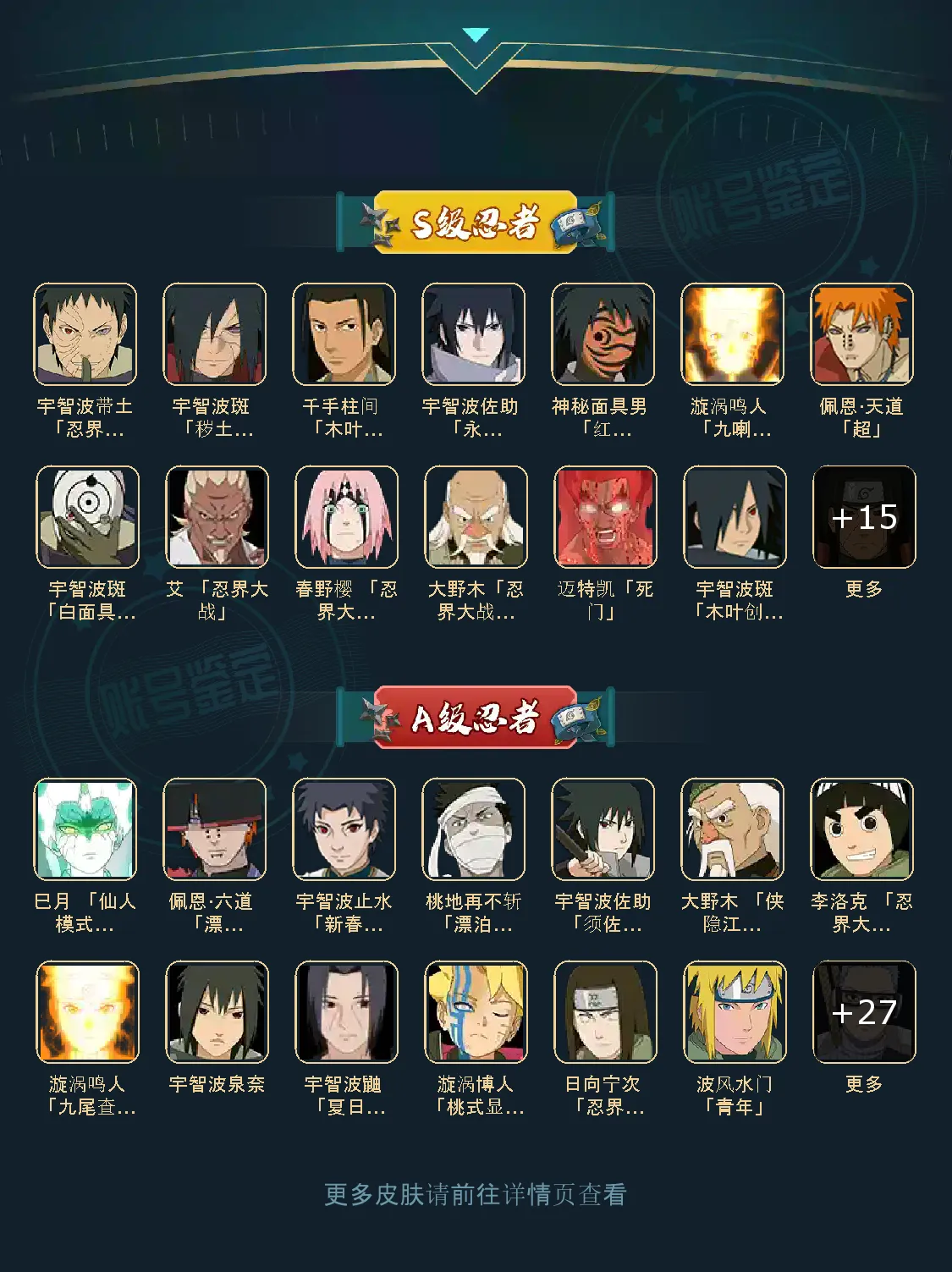 战力:730W+;VIP12级;S忍24个;A忍33个,通灵兽18个,S忍:九喇嘛鸣人永恒万花筒佐助忍战樱普通自来也豪杰自来也大蛇丸死门凯波风水门秽土猿飞千手扉间秽土柱间木叶创立柱间木叶创立斑秽土解斑秽土鼬白面具忍战带土红夜面具男罗砂鬼灯幻