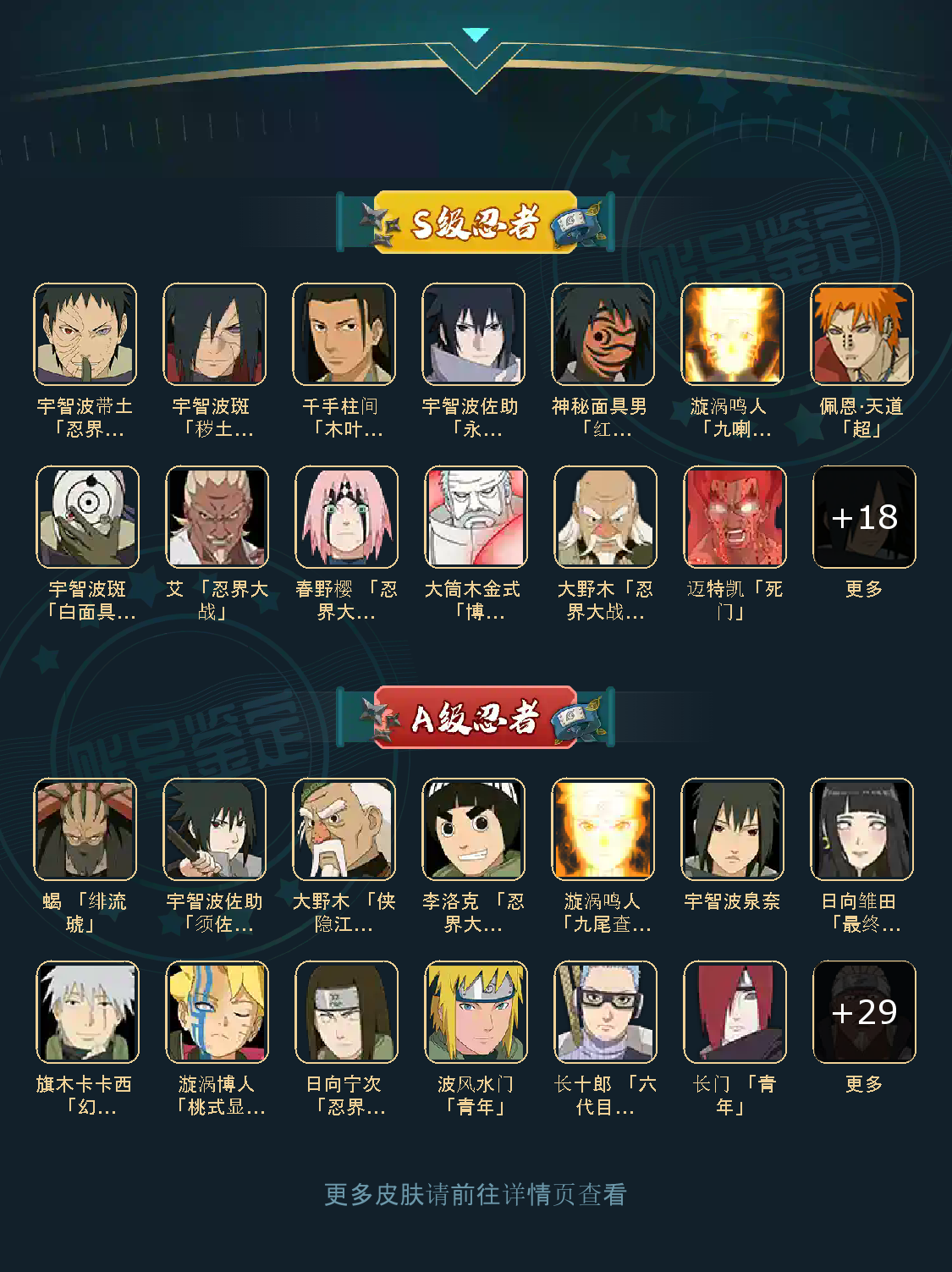 战力:1329W+;VIP11级;S忍28个;A忍34个,通灵兽17个,S忍:普通纲手猿飞日斩九喇嘛鸣人永恒万花筒佐助忍战樱仙人自来也大蛇丸死门凯波风水门豪杰自来也秽土猿飞秽土扉间千手扉间木叶创立柱间秽土柱间秽土斑木叶创立斑秽土解斑须佐鼬秽
