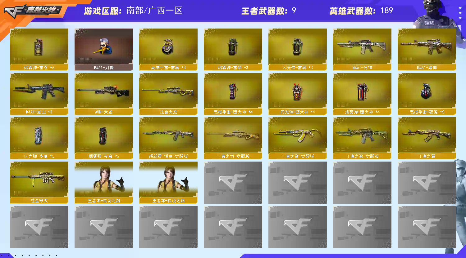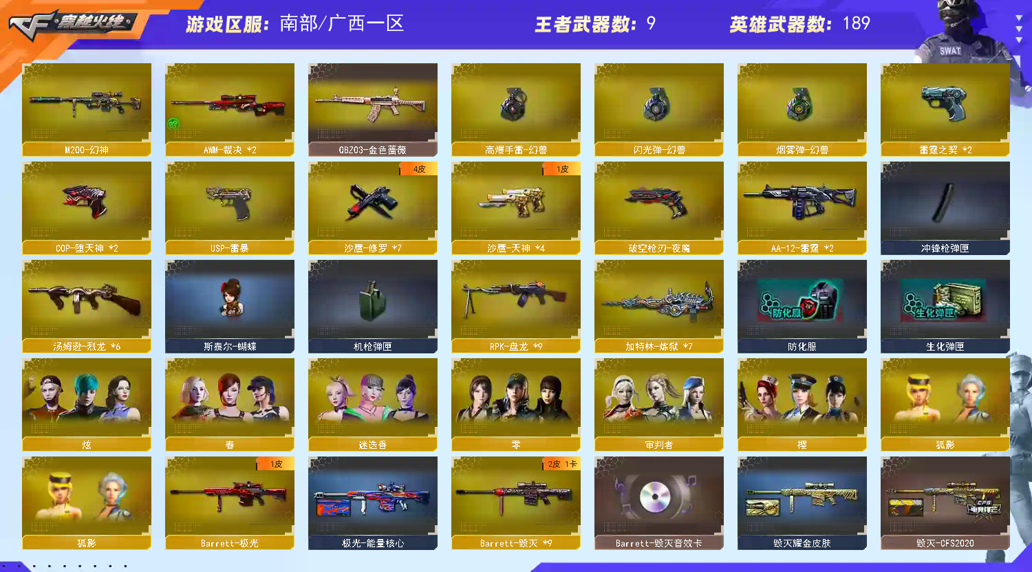 【其他重要武器】炫金天龙/炫金毁灭/炫金修罗/M4A1-仙界-黑骑士/9A91-赤血龙魂(10)/HK417-红龙/AK47-破空冰刃/M4A1-破空冰刃/AK47-青龙/AK12-幽灵/M14EBR-赤血龙魂(2)/M4A1-秘银赤龙(2)/AK47-轮回/火麒麟-桃园结义/HK417-赤血龙魂(5)/M4A1-Guitar 炫彩/AK47-大帝林肯/AK-47-二次元/AWM-深海猎手(4)/AWM-卡通/AWM-红色悦动/EVO III-赤血龙魂(3)/斯太尔-能量核心/征服者-地狱之火 [Lv Max]/征服者-毁灭之王 [Lv Max]/沙鹰-青龙/沙鹰-万圣节2018(2)/凤凰之灵(2)/沙鹰-雷蛇/愤怒公牛左轮-枪王排位(2)/新USP-怒火大圣/幻影Anaconda-枪王排位/沙鹰-枪王排位/USP-黑大圣/修罗-摸金校尉/军用铁锹-飞龙在天/斩魔刀-怒火大圣/蝴蝶刀-枪王排位/猫猫手套(2)/收割者-枪王排位/军用手斧-能量核心/闪光弹-枪王排位/手雷-能量核心(2)/红色诅咒娃娃手雷