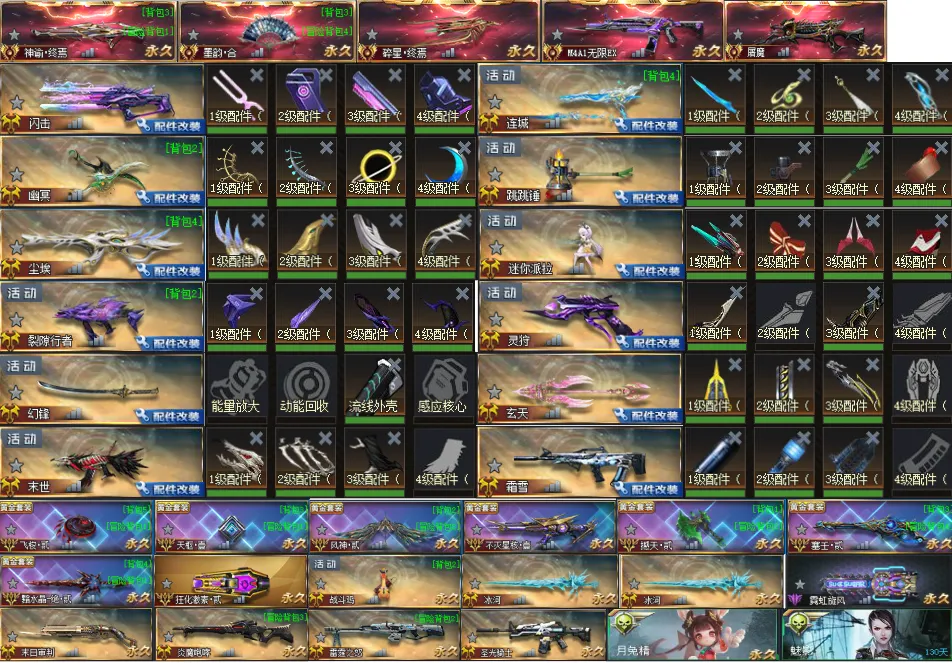 【配件武器】满配闪击、满配幽冥、满配尘埃、满配裂隙行者、满配连城、满配跳跳锤、满配迷你派拉、三配末世、三配玄天、三配霜雪、二配灵狩、一配幻锋