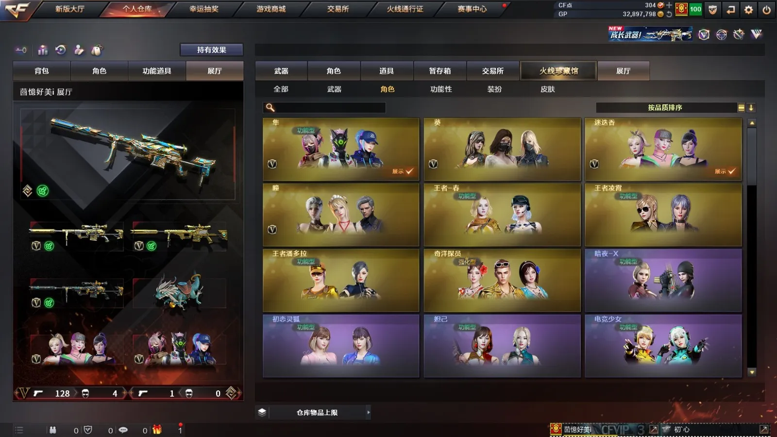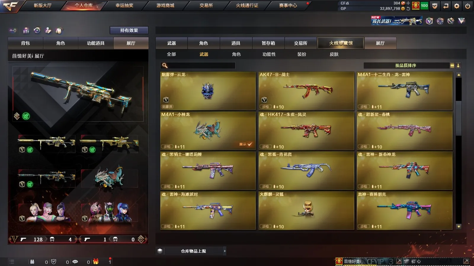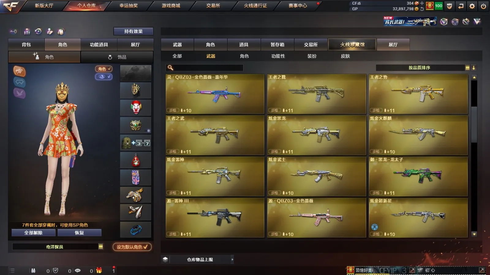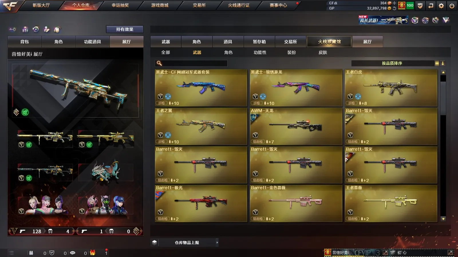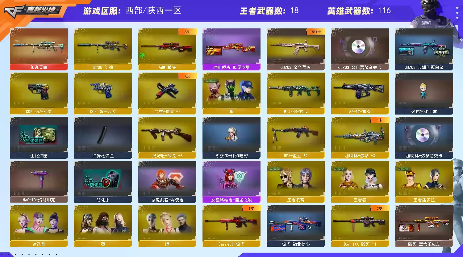 【其他重要武器】炫金超新星/炫金黑龙/炫金火麒麟/炫金雷神/炫金武士/M4A1-十二生肖·龙-雷神/激光毁灭者III/海浪AK47/AK47-万圣节2018/G3A3-SS-枪王排位/AK47-绚樱/AK47-B-十周年/9A91-赤血龙魂(3)/AK47-破空冰刃(2)/HK417-赤血龙魂/AK47-轮回/AK47-圣诞节[2019]/AK47-SS-枪王排位/M4A1-青龙./M4A1-SS-枪王排位/M4A1-紫狱/M4A1-破空冰刃/M4A1-电音/AK47-青龙/AK47枪王排位II/M4CQBR-AP-孔明/AK-12-恶棍/XM8-炫彩/AK-47-红龙/雷神-赛博朋克/M4A1-万圣节2020(2)/AK47-狂欢-CFS/M4A1-狂欢-CFS(2)/M4A1-秘银赤龙/金色小号/Scarlight-炫彩/M4A1-小神龙/M4A1-圣诞2021/M4A1-S-能量核心/M4A1-紫炎/AK47-苍龙/AWM-Pink/98K-蓝色骑士(2)/凤凰之力/98K-烛龙/AWM-2018圣诞/M200-赤血龙魂(2)/巴雷特-情人节2020(2)/M200 CheyTac-大圣/AWM-A枪王排位II/M200-圣诞/Barrett-翔龙/M200-牡丹/M200-涂鸦/AWM-十周年/M200-万圣节/AWM-恶棍/M200-青花瓷/AWM-Red/蓝色魅影(2)/AWM-7周年/M200-枪王排位/AWM-CFS 2020/AWM-恶棍-枪王排位/AWM-T/Barrett-苍龙/KAC-赤烛/阿梅利轻机枪-暗夜风暴/EVO III-赤血龙魂/斯泰尔-巧克力/MK5-枪王排位/EVO3A1-火线13周年/EVOIII-萌杀/神圣爆裂者-末日/Spas-12-幻能朋克(2)/SPAS-12-雷电核心/Anaconda-黑金神龙/新USP-枪王排位奖励(4)/沙鹰-枪王排位(3)/凤凰之灵/沙鹰-青龙(2)/Anaconda-雷电核心/幻影沙鹰-枪王排位(2)/愤怒公牛左轮-枪王排位(2)/幻影Anaconda-枪王排位/COP-金蝉子-枪王排位(2)/MAC-10-幻能朋克/COP-机甲刑天/新USP-怒火大圣/COP 357--绚樱/Cop357-萌杀/COP357-绚樱-圣诞/无畏之矛/丛林匕首-卧龙(3)/幻影双斧-枪王排位(2)/军用铁锹-飞龙在天/军用铁锹-赤龙/丛林匕首-枪王排位/虹光丛林匕首-枪王排位(2)/幻影扳手-枪王排位(2)/斩魔刀-怒火大圣/鹰爪-枪王排位/胜利奖杯手雷-枪王排位(3)/闪光弹-枪王排位(2)/胜利奖杯烟雾弹-枪王排位(2)/胜利奖杯闪光弹-枪王排位(3)/手雷-能量核心